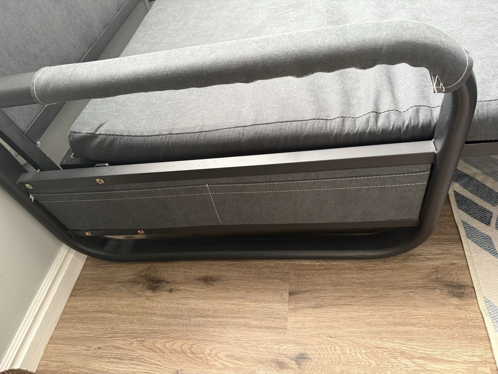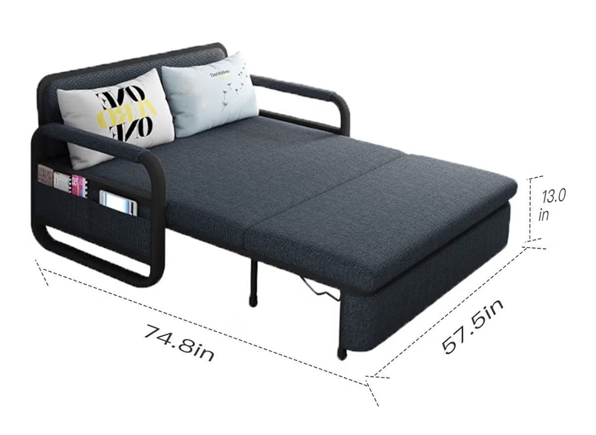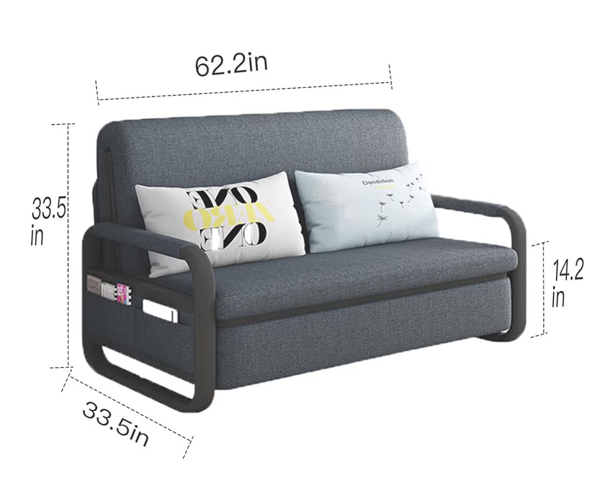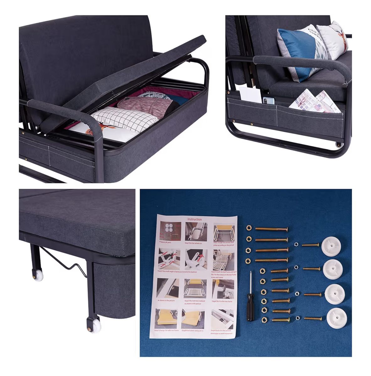 ApplePayLove seat couch sofa Fold out bed Dark grey 59 inch wide Full size foam mattress Futon Compact folding bed Storage for bedding Piaqia brand
