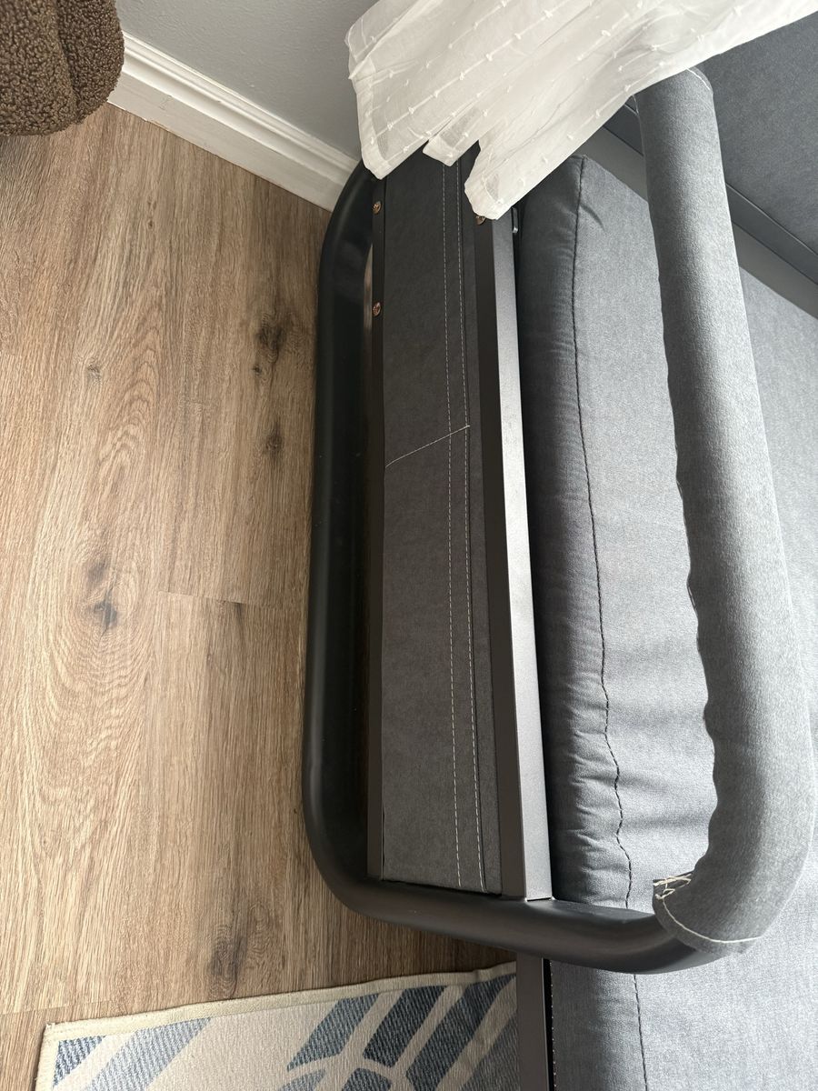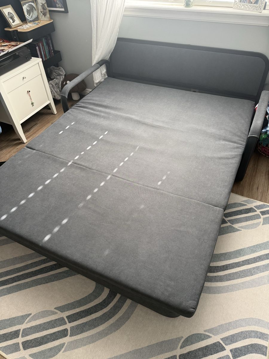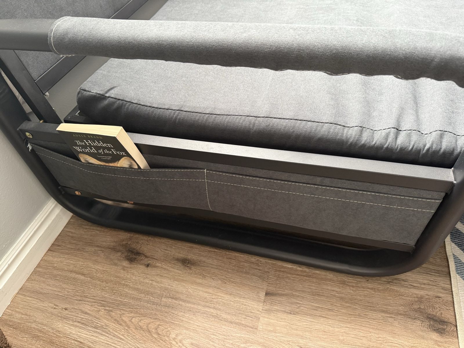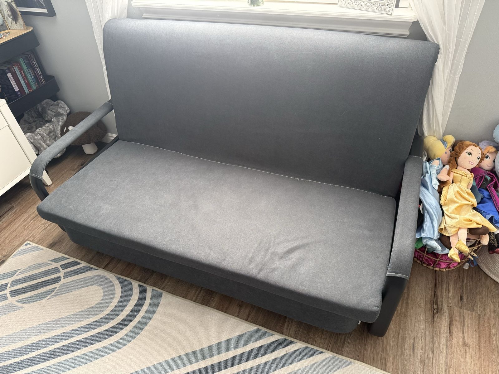 ApplePayLove seat couch sofa Fold out bed Dark grey 59 inch wide Full size foam mattress Futon Compact folding bed Storage for bedding Piaqia brand