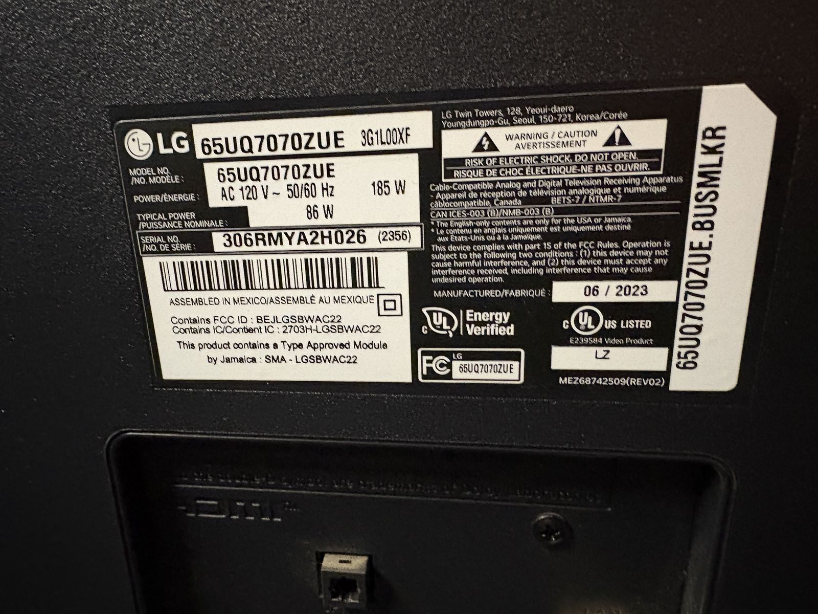 Selling my LG 65UQ7070ZUE 65-inch Smart TV. Works great, clear picture, no issues. Clean and well taken care of. Perfect for a living room, bedroom, game room, or man cave.