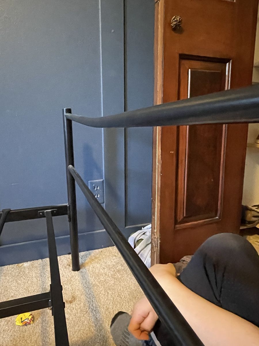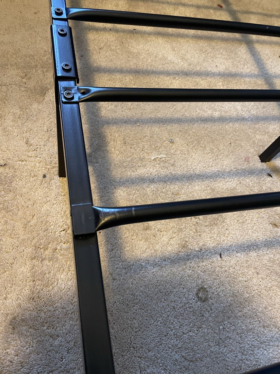 VenmoReally good quality sturdy metal bed frame! All hardware is there, with picture of where they go. The only flaw is a very slight bent top bar at the foot of the board (pictured). Paid almost $90 originally, asking $50 OBO.