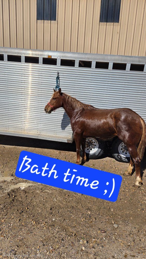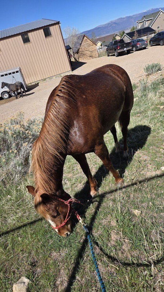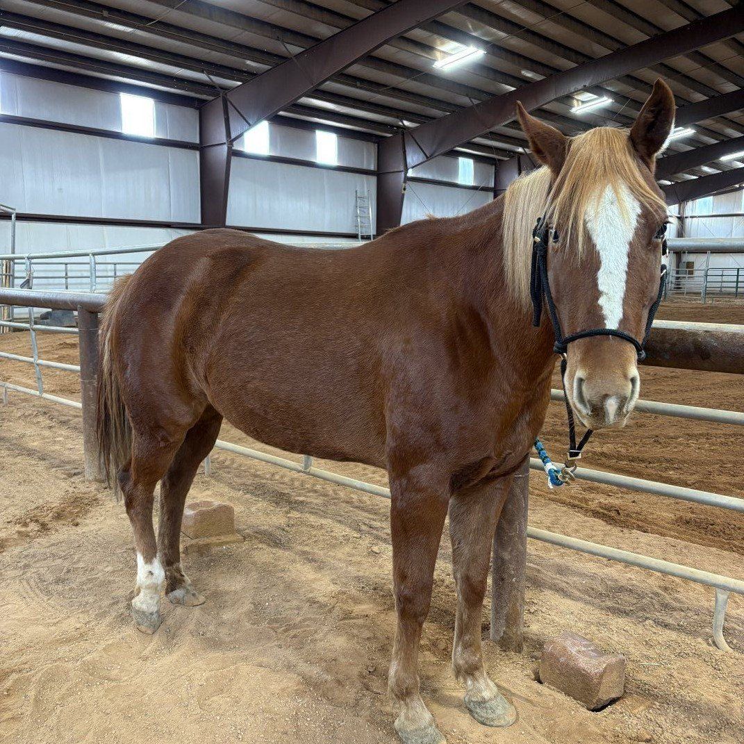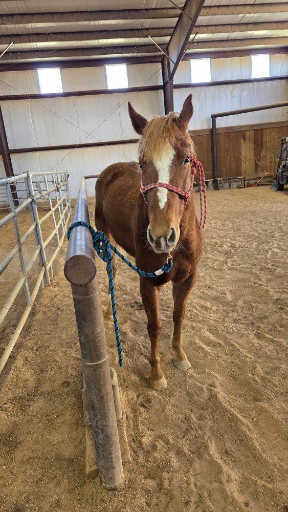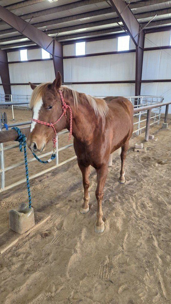 6-year-old grade mare looking for her next home. She has experience being worked in the arena and is green broke. She’s willing and has a good foundation, but still needs consistency and someone to continue her training.