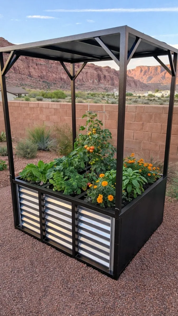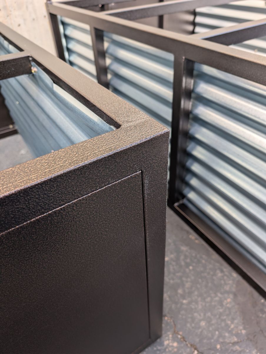 Durable Powder Coat Finish (Copper Vein) on the metal frame, and galvanized sides. These garden boxes have been repurposed from shipping crates. These will look great for years to come!
