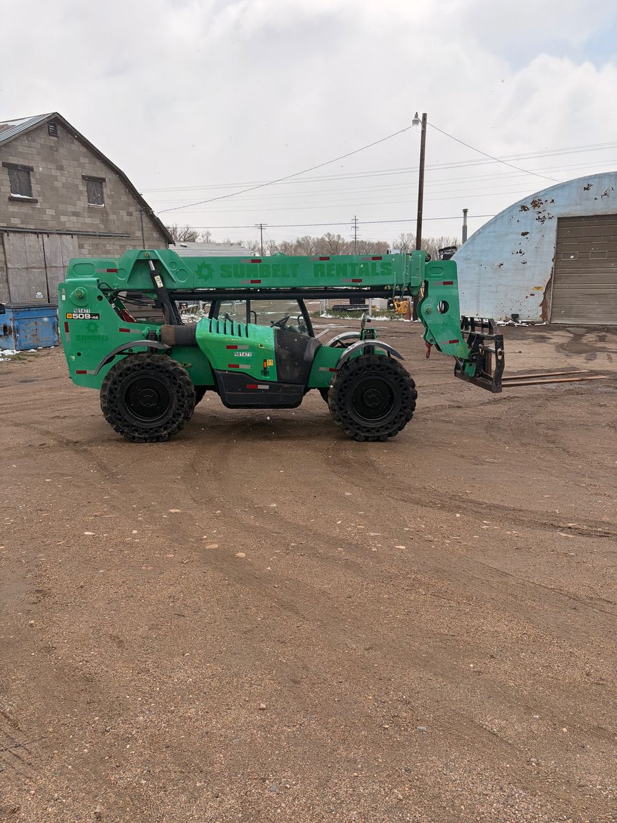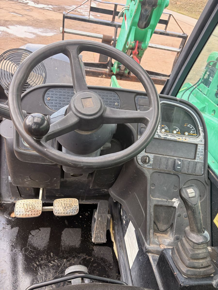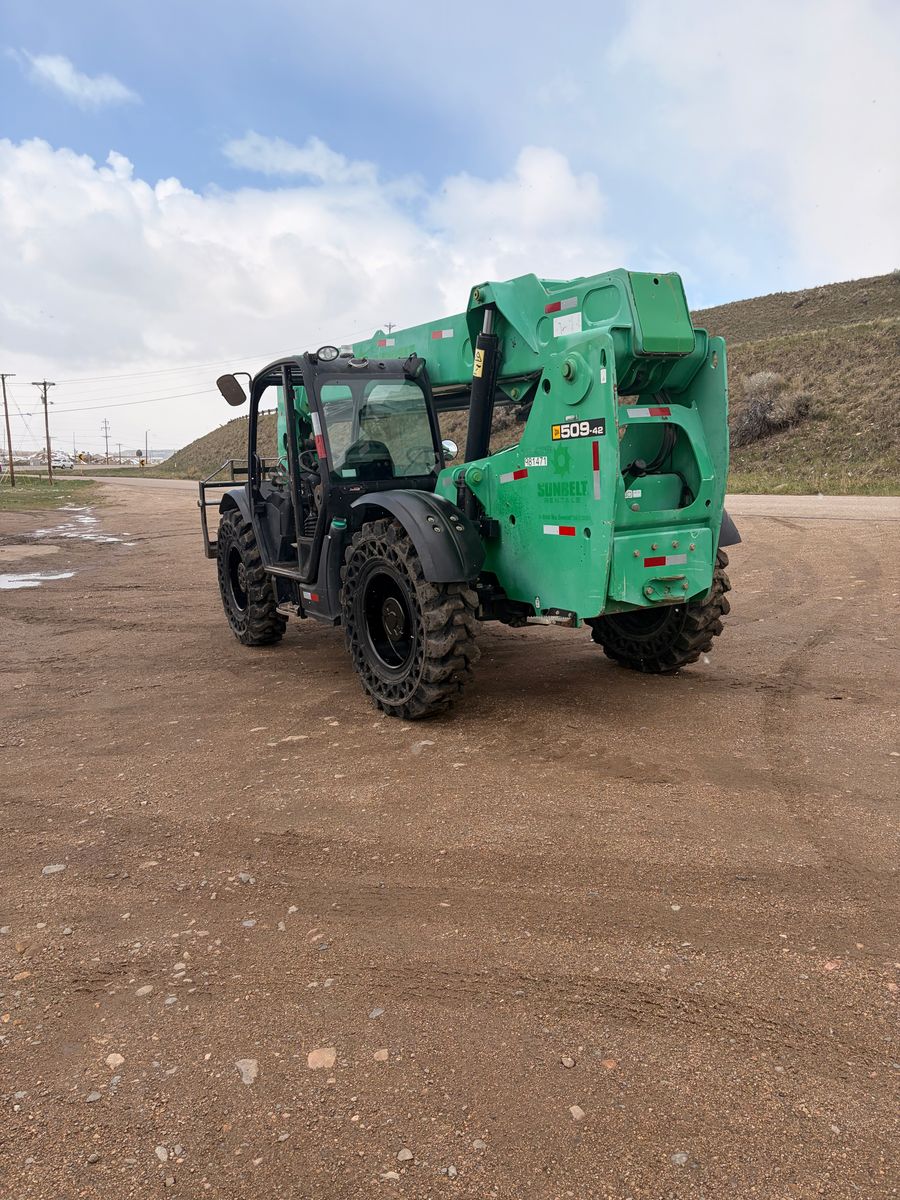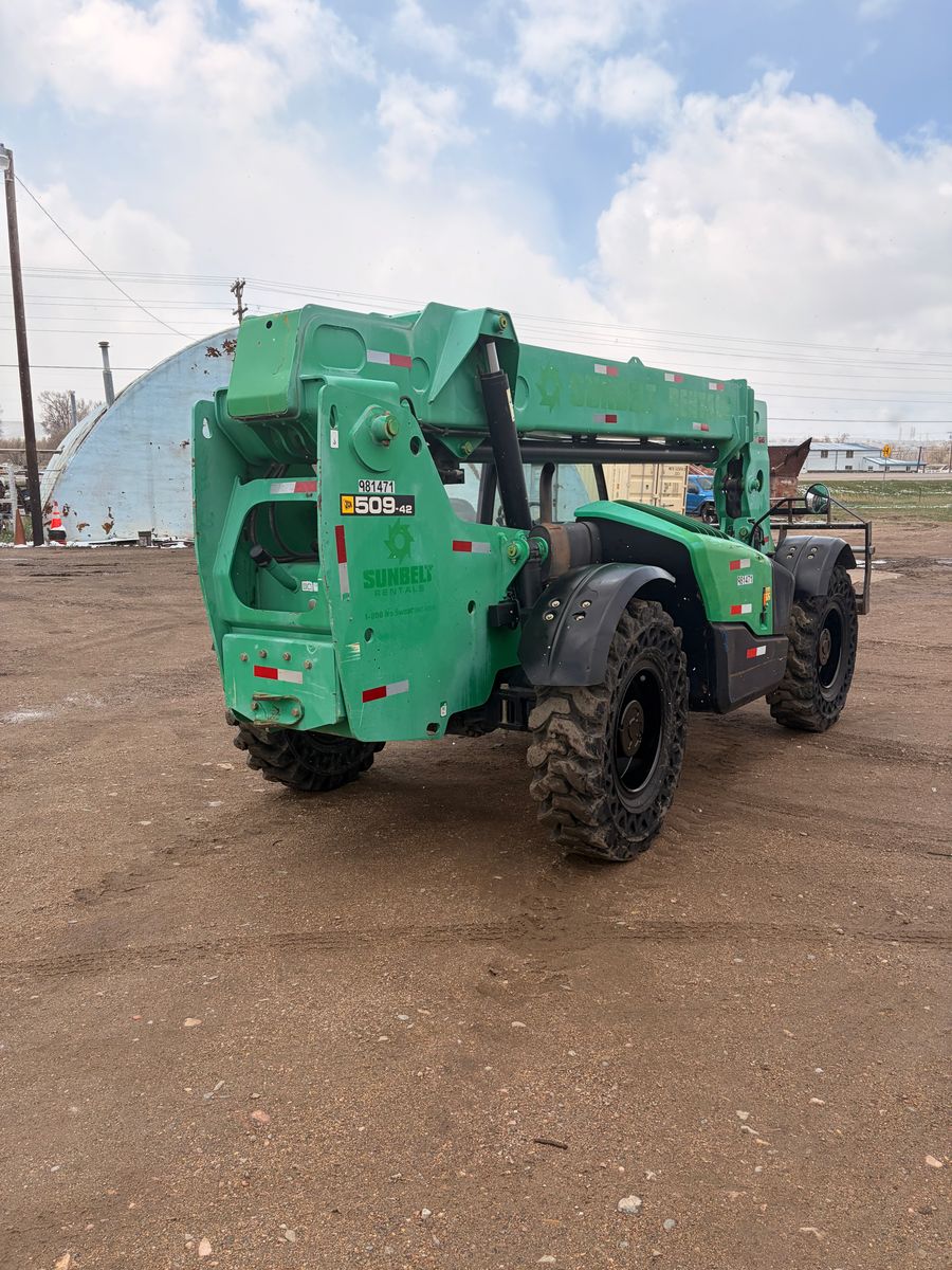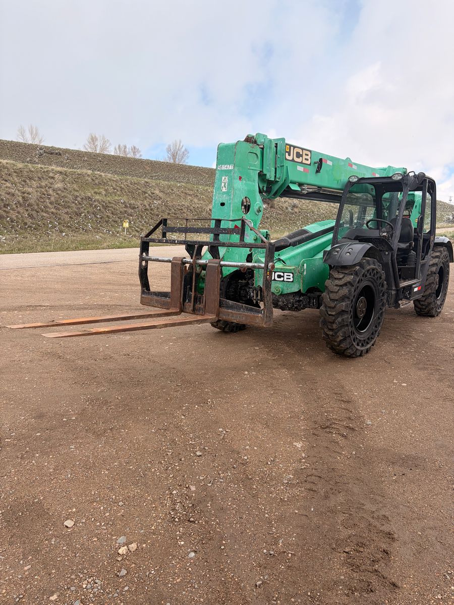 Year: 2017 Make: JCB Model: 509-42 Telehandler Engine: JCB EcoMax 74hp Diesel (NO Def) Transmission: Powershift Hours: 4249 showing Tires: Solidair Solid Rubber @ 80% S/N: JCB5CF7GP2435820 Detail: 42′ Lift Height, 72″ Forks, Cab Tilt, Crab Steer.