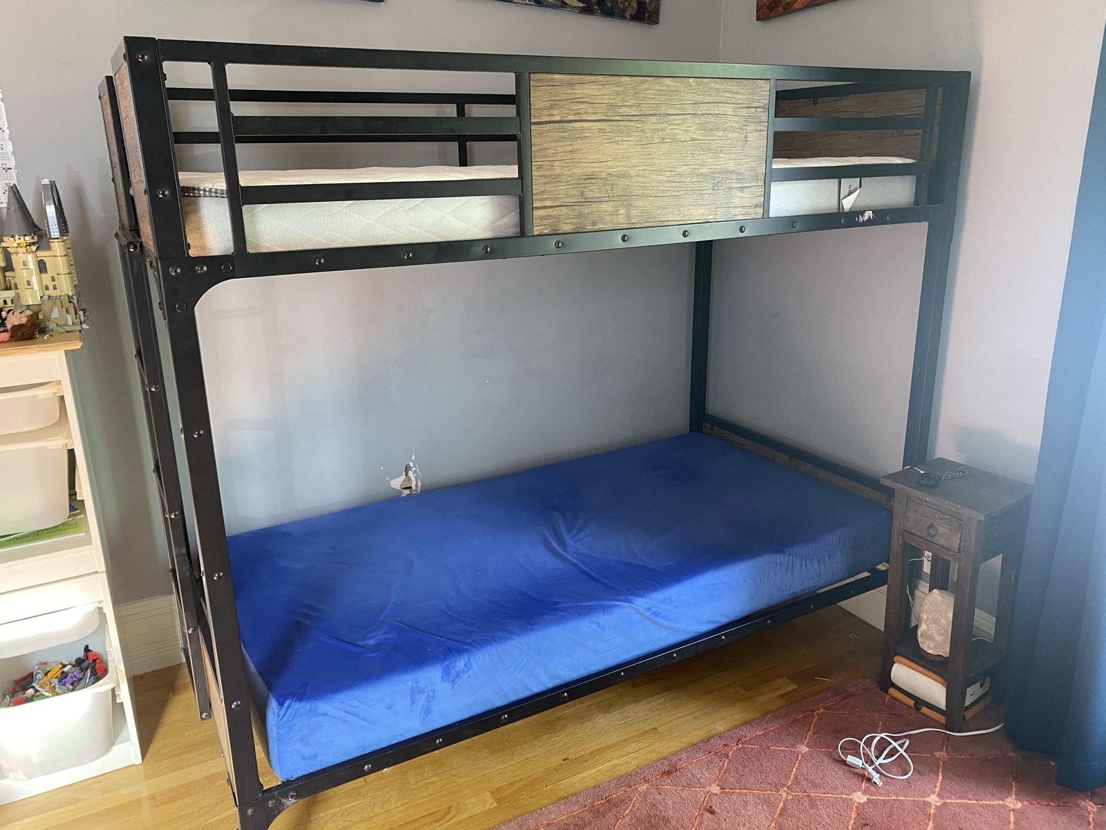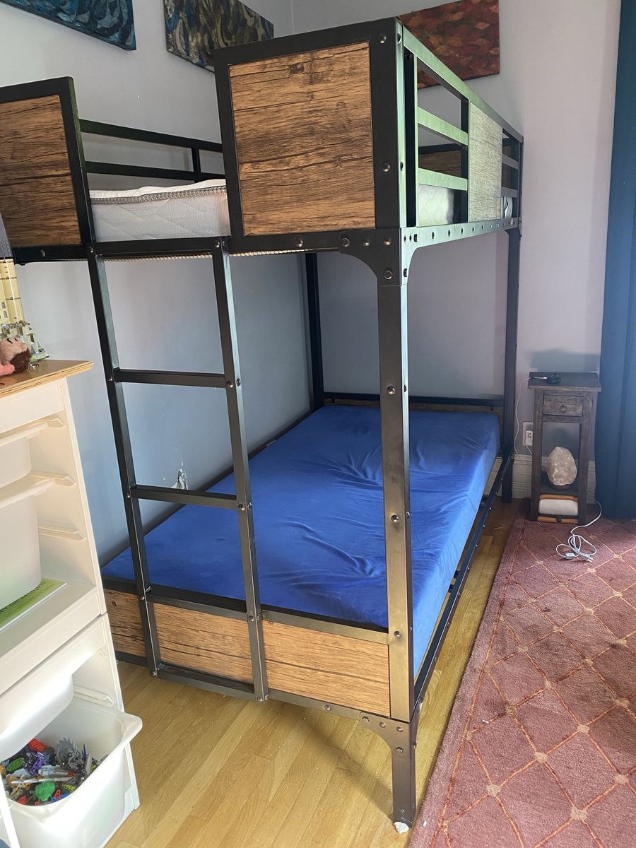 ZelleMetal bunk bed with wood accents. Will be broken down for pickup. Approximately 5’6” x 6’5”. Mattresses included.