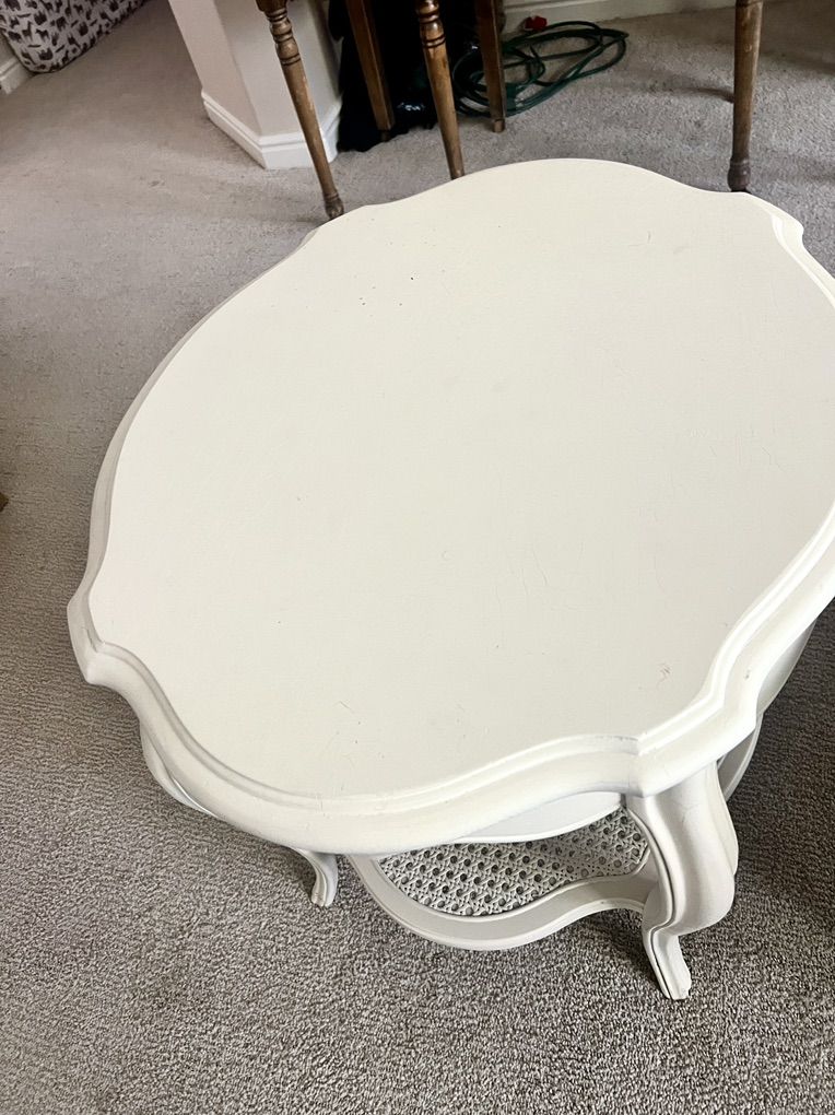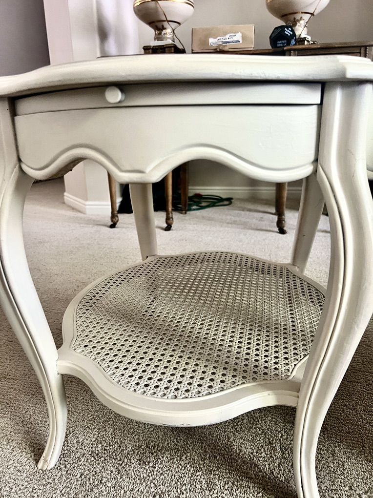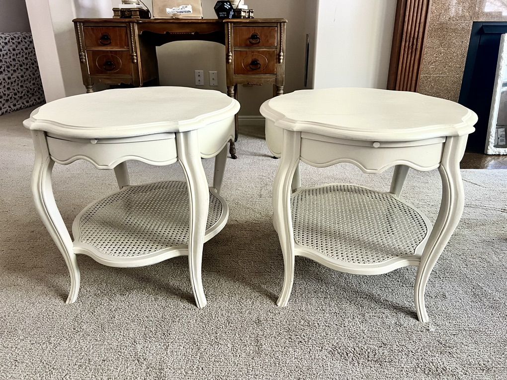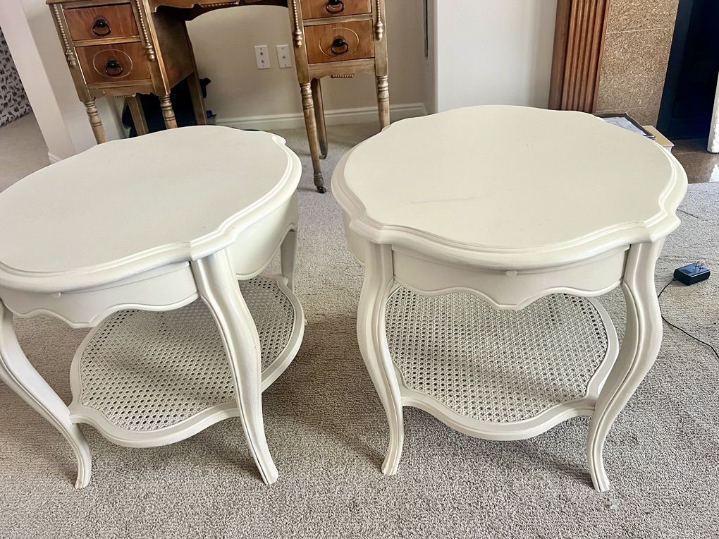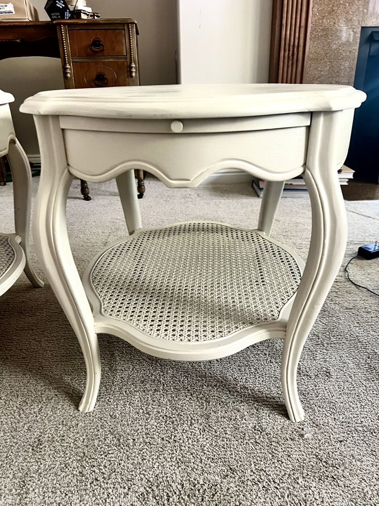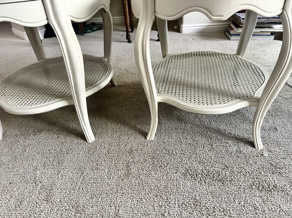 Venmo2 Vintage End Tables $200 both 26.5” x 23” 21” H Painted a soft ivory color The cane is intact on the bottom shelf