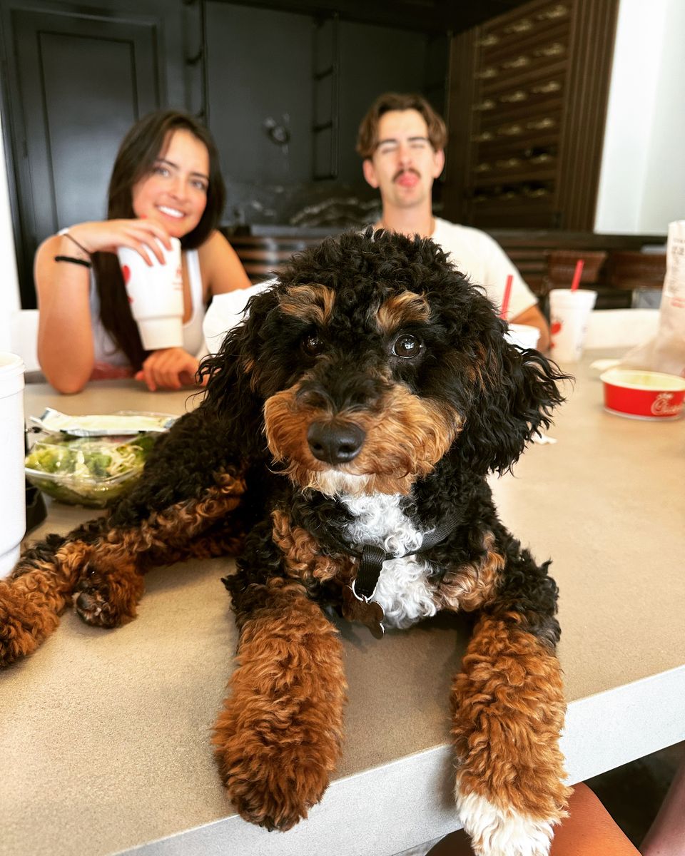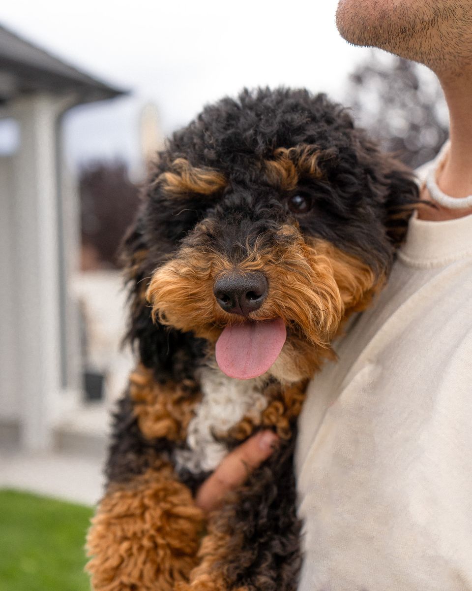 Bobo is the sweetest Miniature Poodle. He is calm, affectionate, and has beautiful markings with perfect tri-color genetics. His coat that passes down to his offsprings has a bold white tuxedo chest, outlined by warm brown tones and rich copper tan points above his eyes and on his legs.