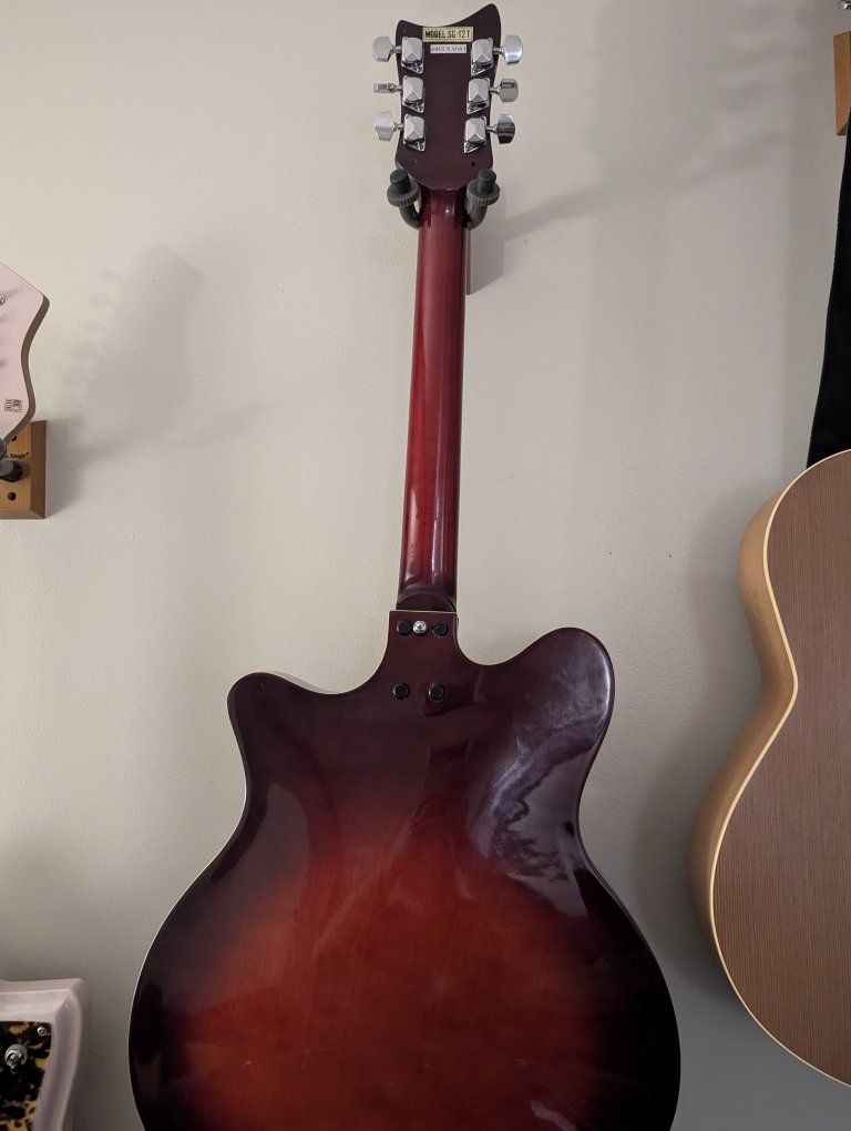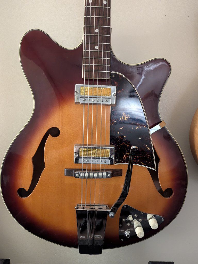 Up for sale is this vintage made in Japan Guyatone SG-12T hollowbody guitar in good condition. The tuners and string tree have been replaced. Most importantly it comes with the original gold foil pickups and the electronics all work great.