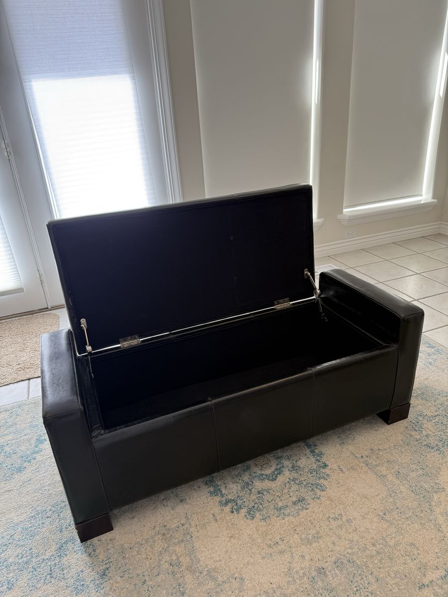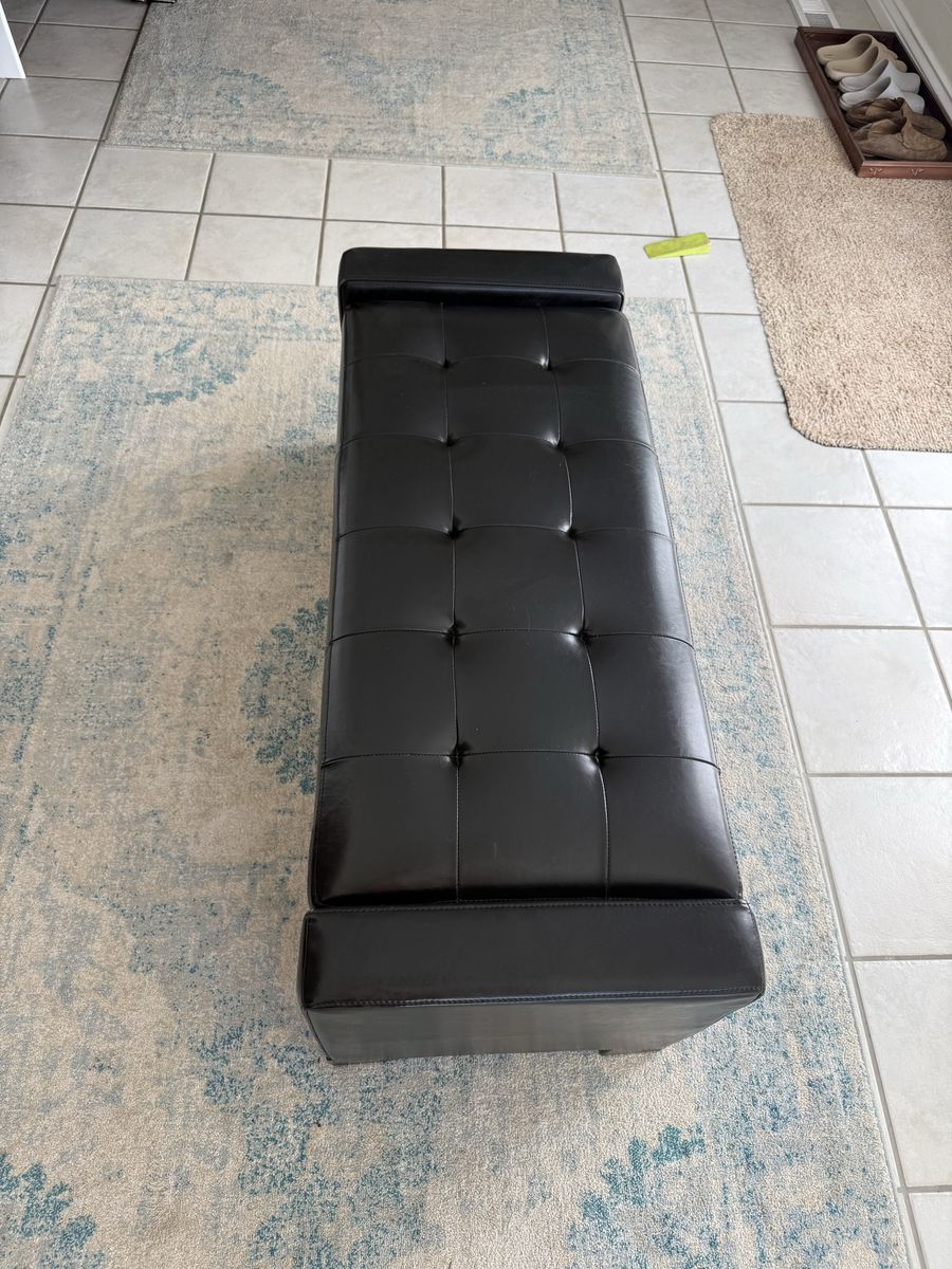 ApplePayBlack modern tufted bench. 50” long 18” tall and 20” wide. Opens to a storage area that is 10” deep 31” long and 16” wide. The bench is in great shape and has been used in a low traffic area of our home.