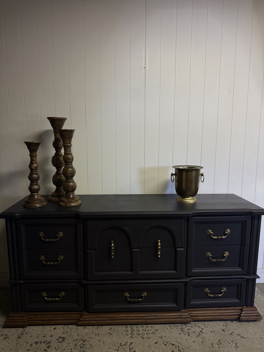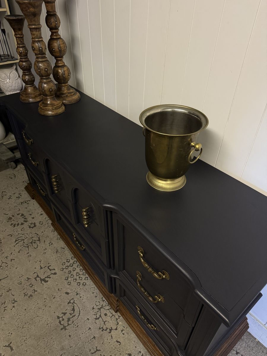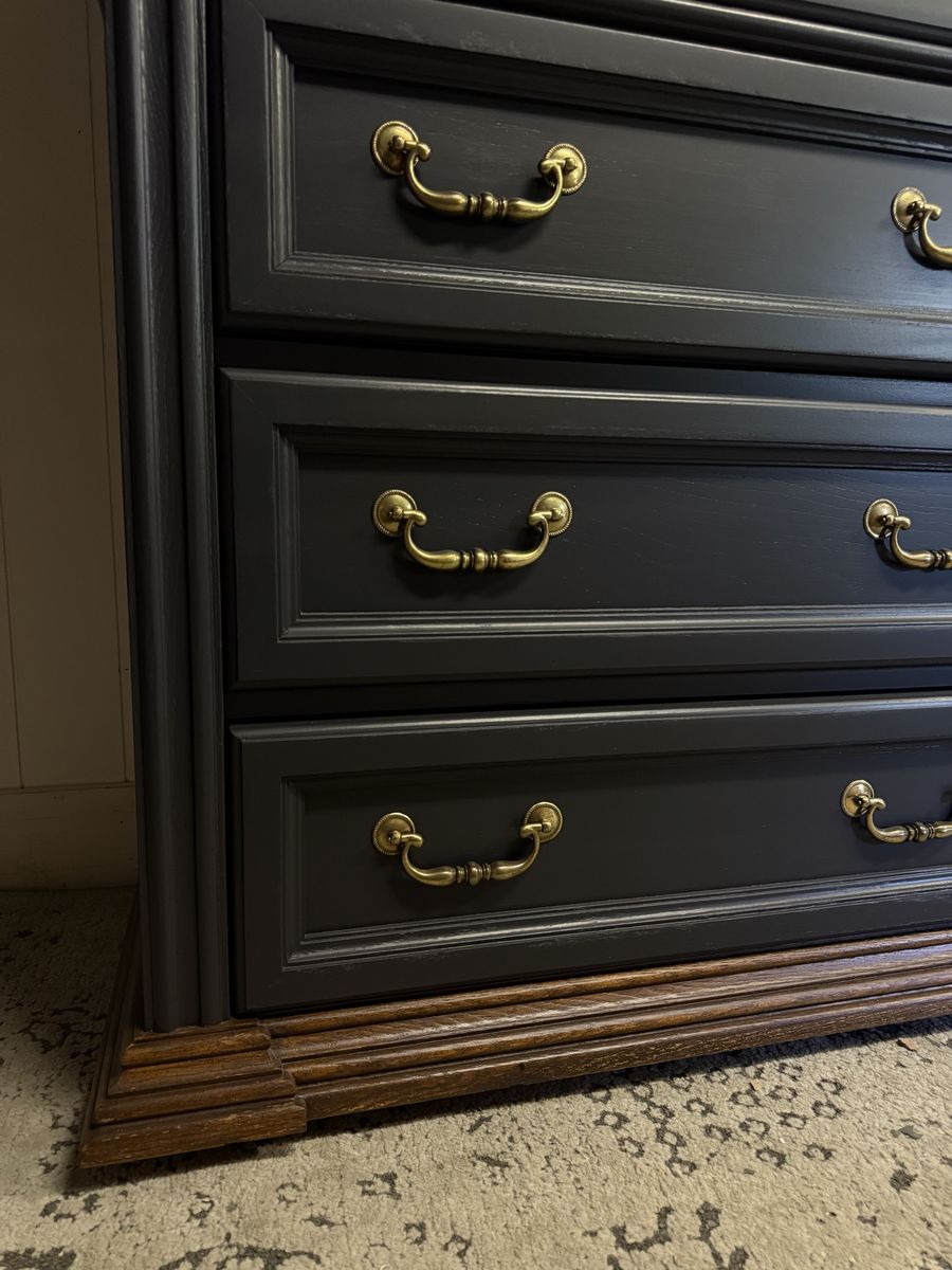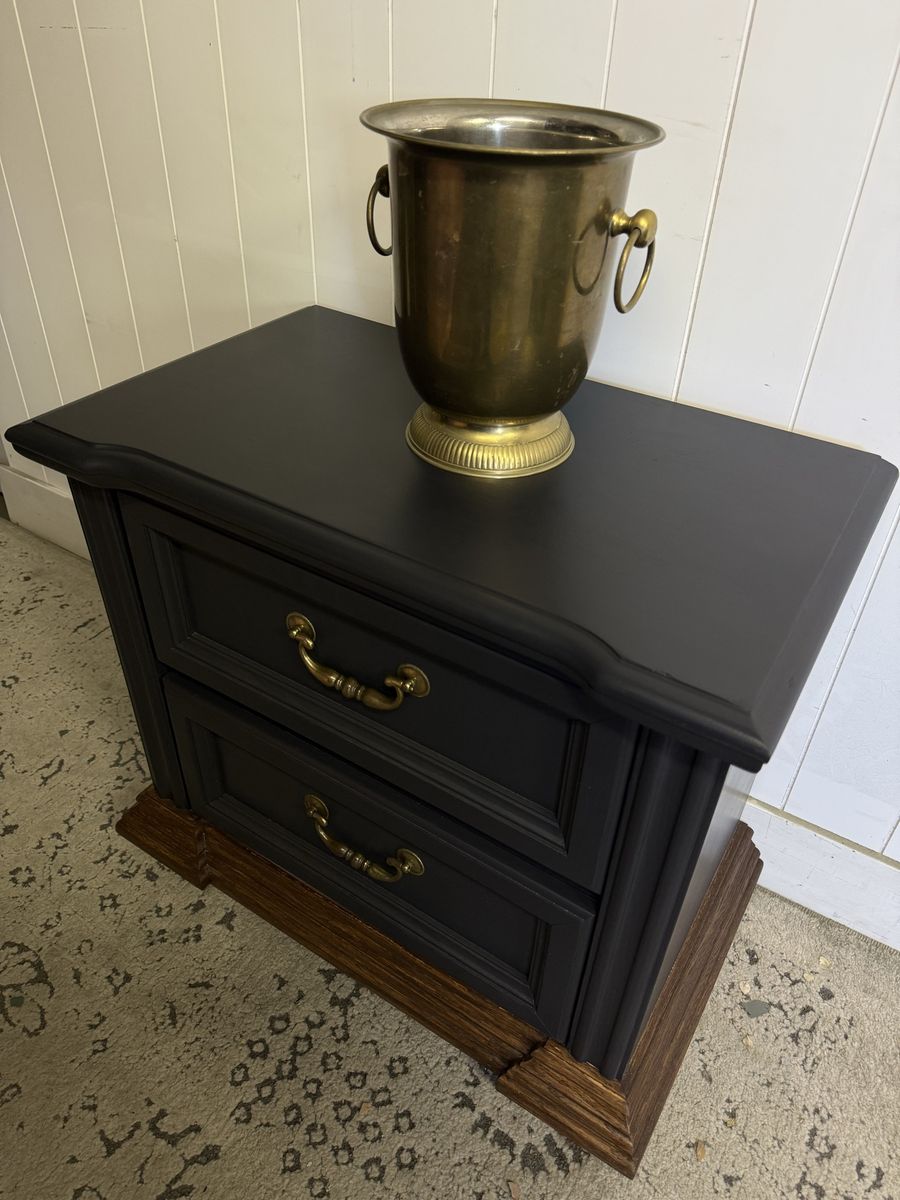 VenmoBeautiful Bassett solid wood dresser set refinished in a custom black with original brass hardware and Hickory stained base. This set includes a tall chest with 5 drawers, a long dresser with 9 drawers and a nightstand with two drawers. All top drawers on each piece have been lined with a beautiful liner, all drawers run properly! Great solid heavy set!