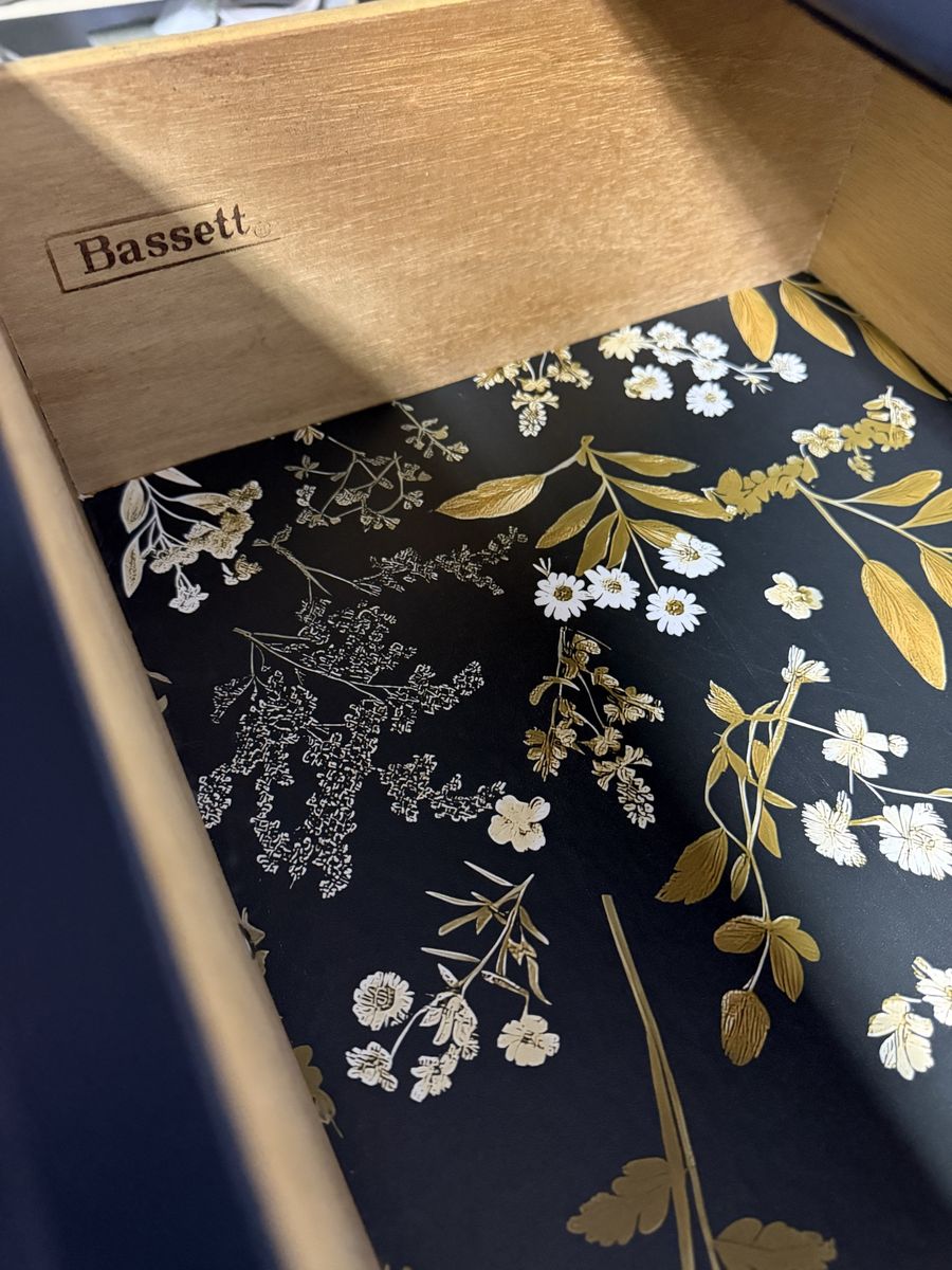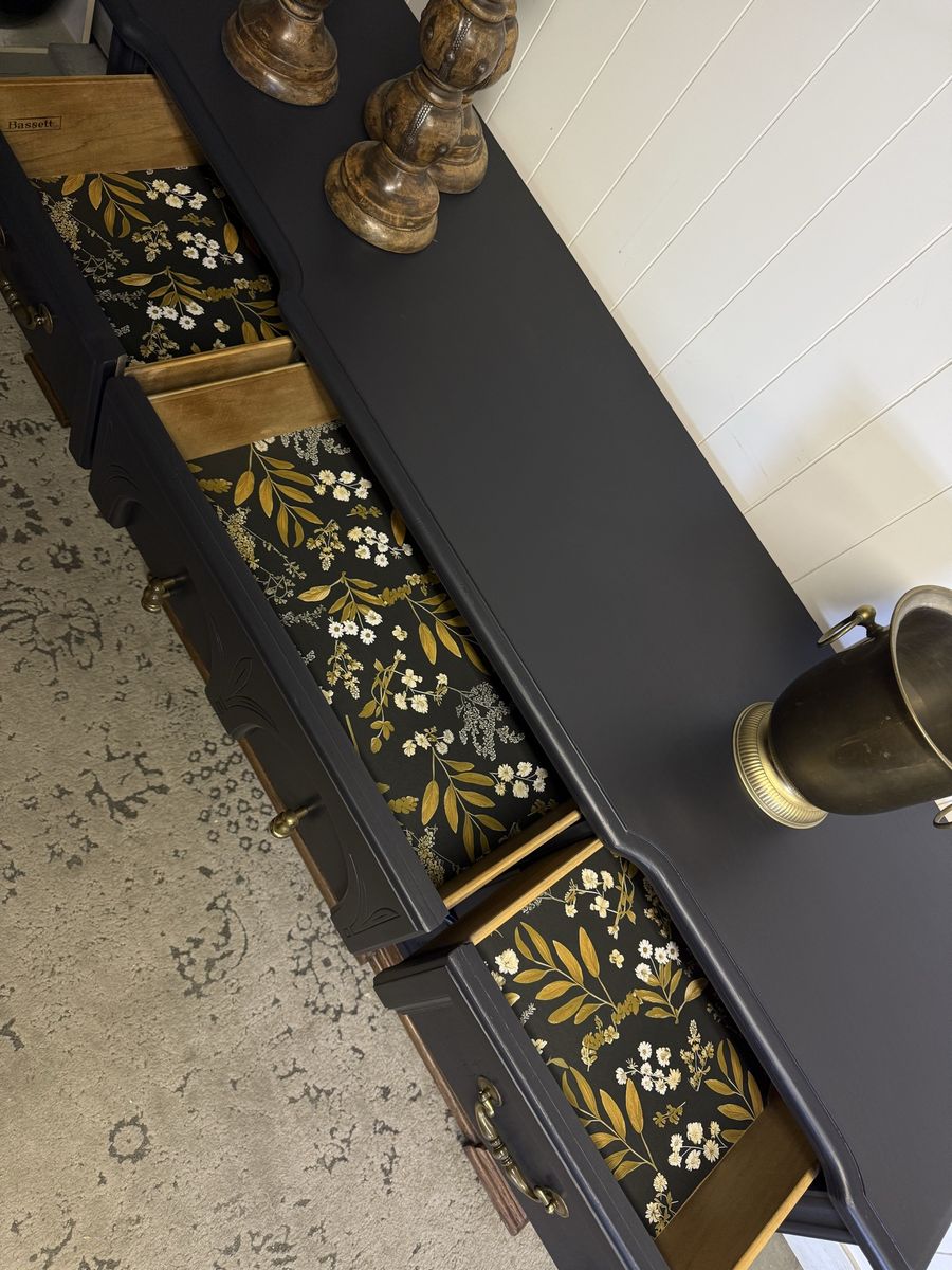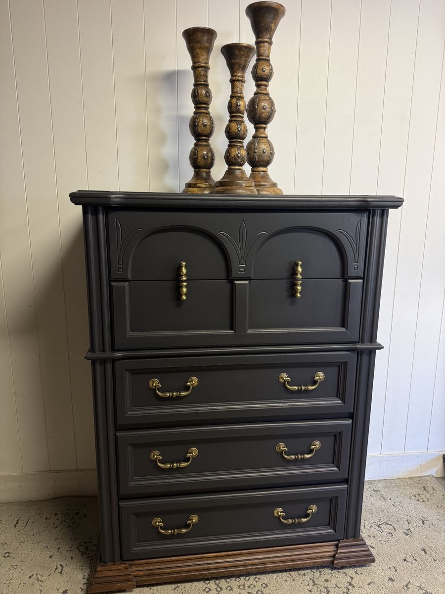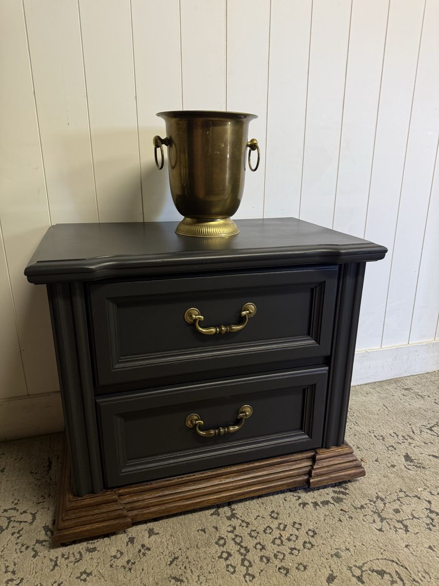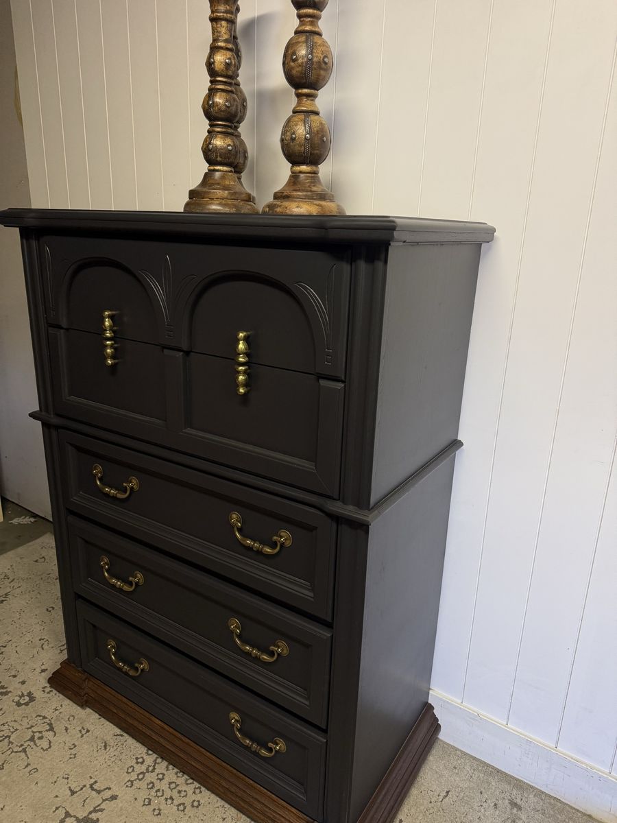 VenmoBeautiful Bassett solid wood dresser set refinished in a custom black with original brass hardware and Hickory stained base. This set includes a tall chest with 5 drawers, a long dresser with 9 drawers and a nightstand with two drawers. All top drawers on each piece have been lined with a beautiful liner, all drawers run properly! Great solid heavy set!