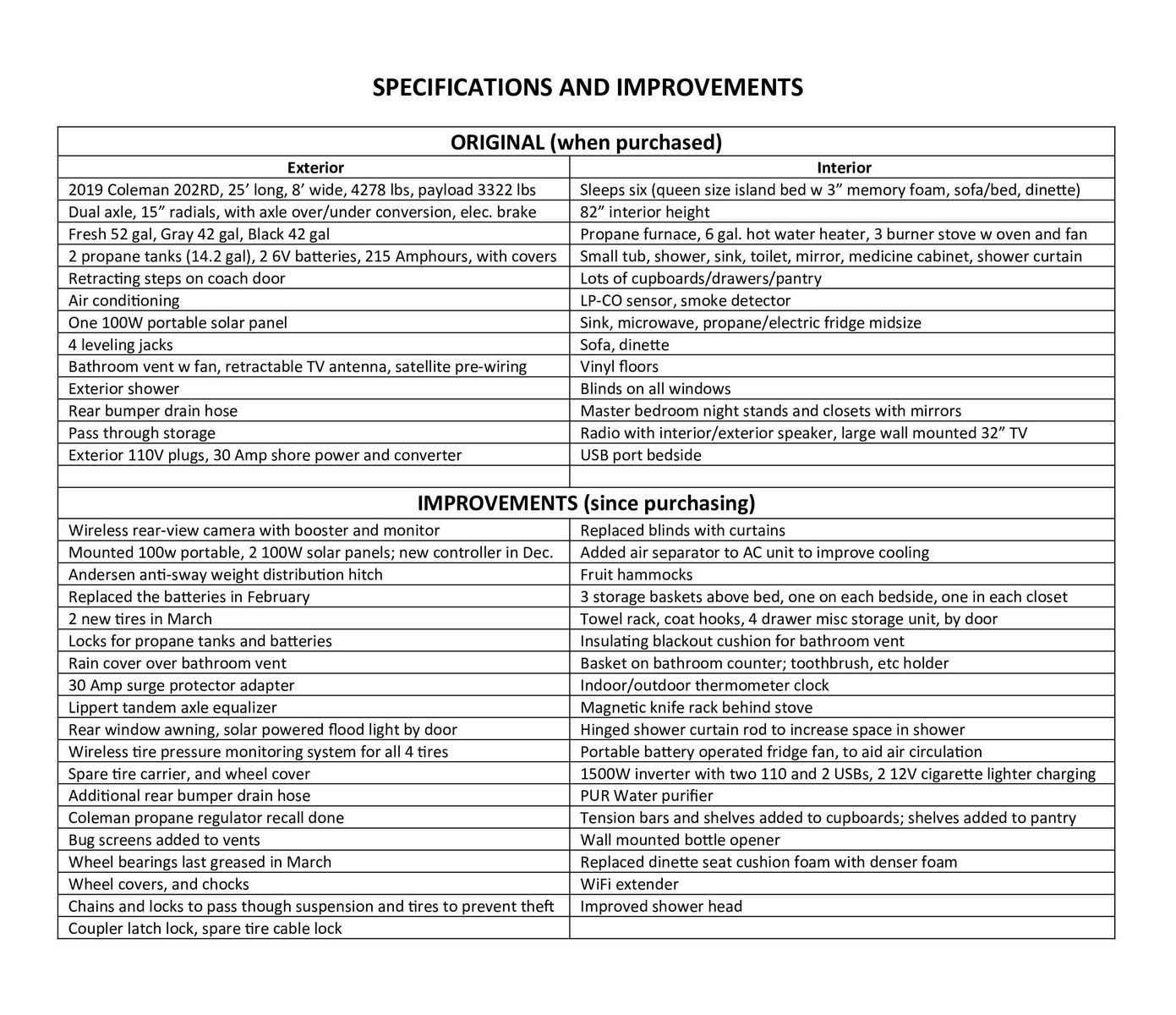 Roof inspected and maintained every 6 months – never a leak. Wheel bearings repacked annually. Everything in working order. Manuals, warranties, and repair and maintenance records will be provided. As well as many back-up/ spare parts.