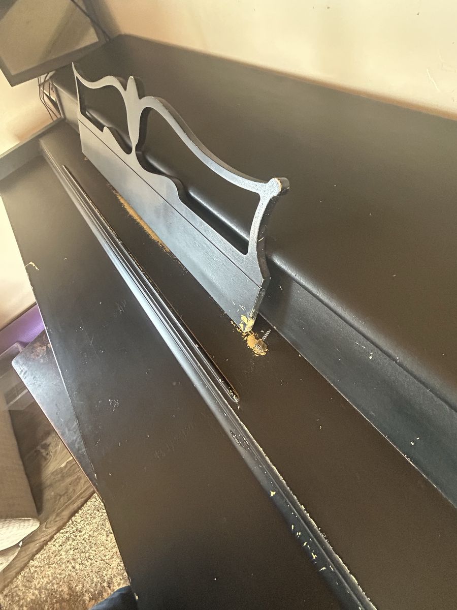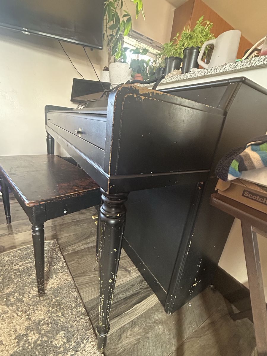 CashAppBlack piano needs some love, plays good just has lots of paint ware, and the music stand needs some screws.