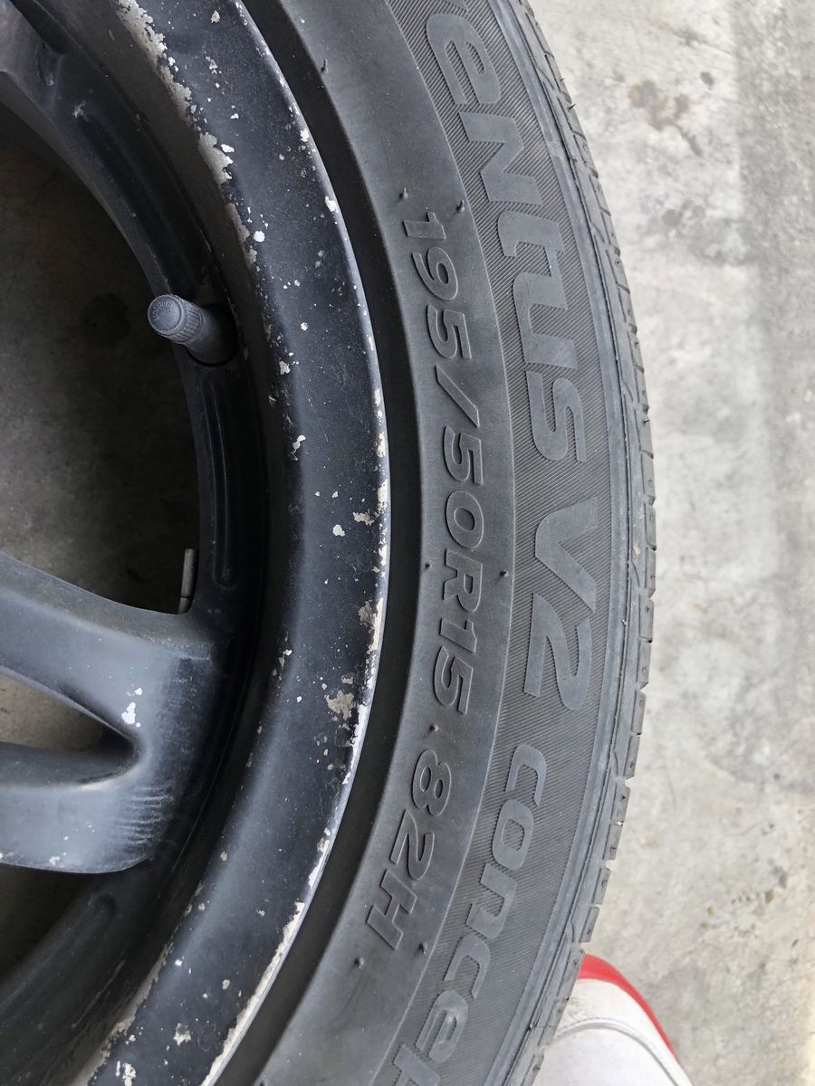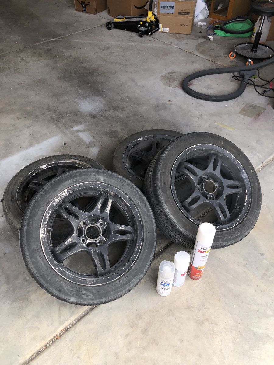 4x100 15x 6.5 The wheels were painted black at one point and the paint is fading I have white paint and clear coat I will throw on top so you can paint them if you would like 3 tires are almost new but one of them has a small hole in them shown in the picture The other tire is decent No cracks in the wheels I have center caps for 3 of them $180