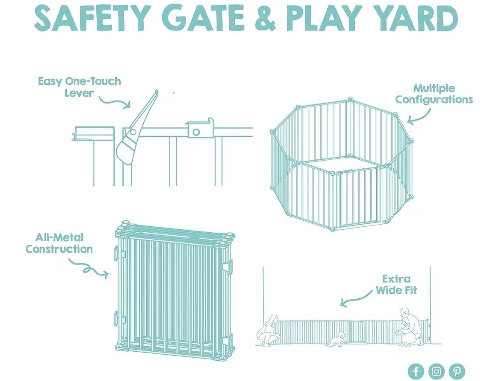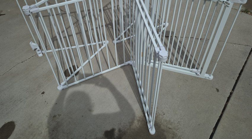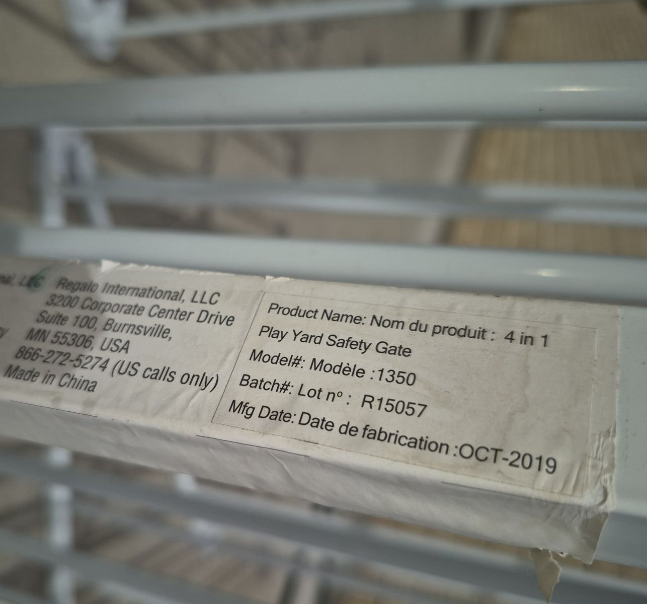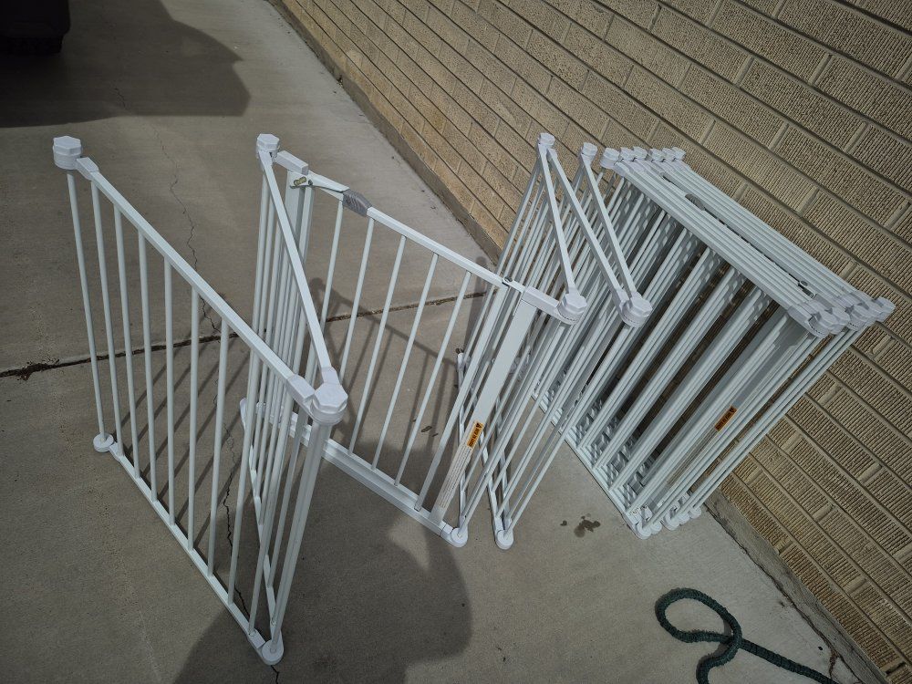 Venmo2 sets of Regalo 4-IN-1 Play Yard & Superwide Safety Gate Playpen Each set has 8 panels with a door and measure 192 inches long. Each panel is 28" tall. Adjustable, panels can be added or removed. White metal. Two wall mounts included. A total of 16 panels including two doors 384" wide Clean, Great Condition!