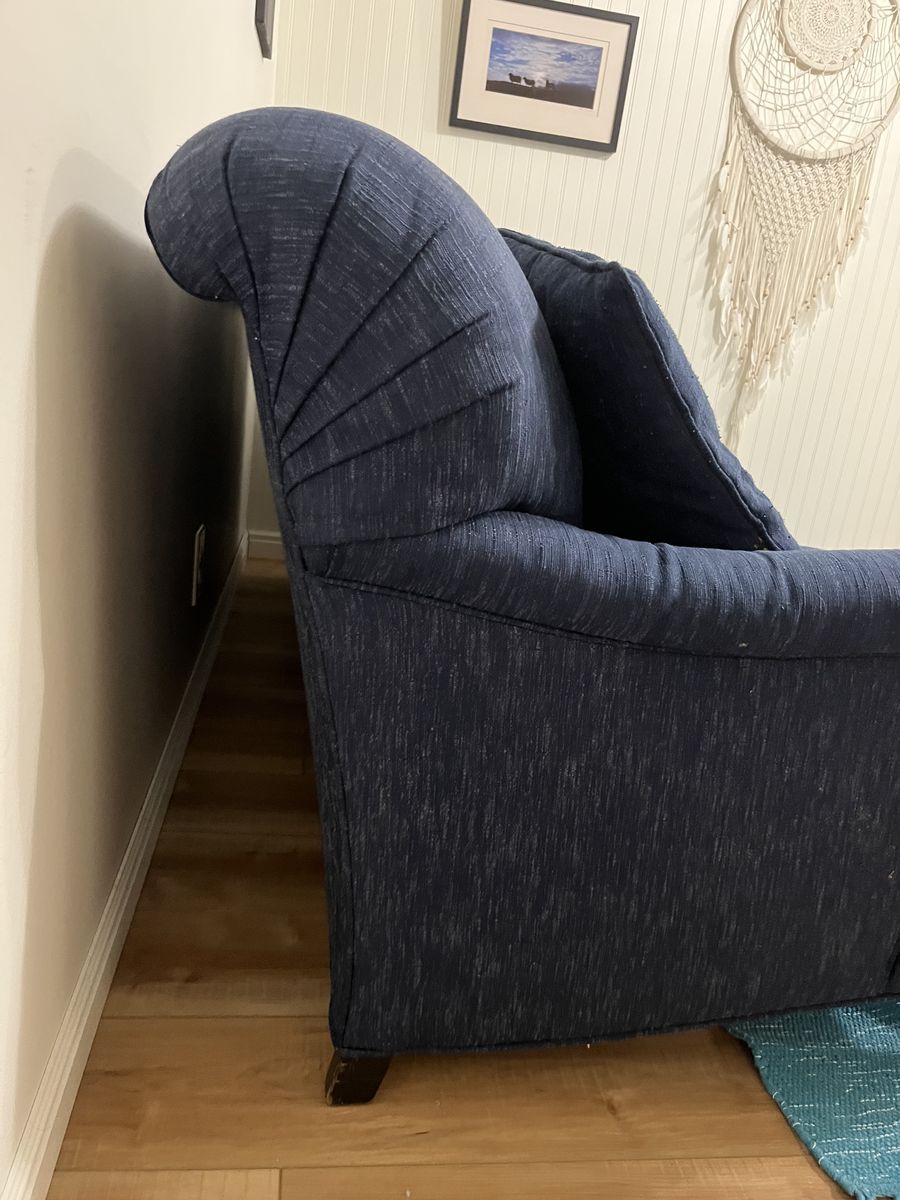 VenmoNavy blue sofa in very good condition. The legs have some scratches but otherwise the fabric is great. Comfortable and comes with 2 pillows the same color. Dimensions: