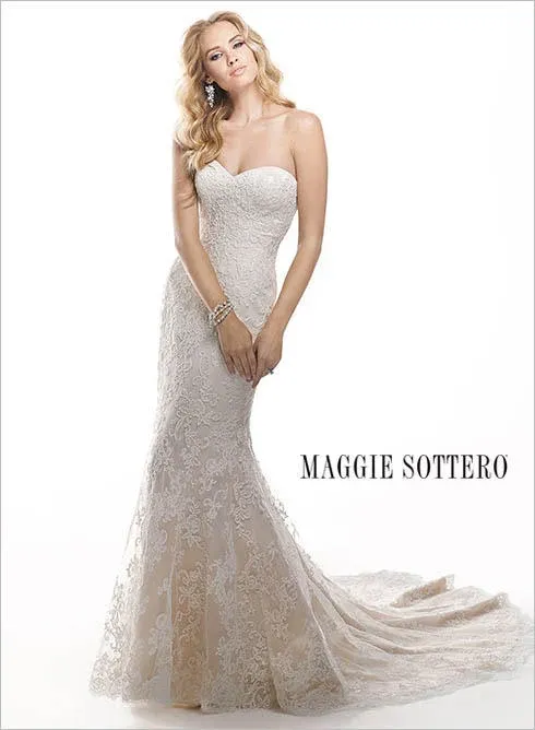 VenmoMaggie Sottero Couture-Chesney Chesney-4MS853 Ivory lace built in corset. Included a dazzling Swarovski crystal jacket lays atop a strapless lace gown, a classic silhouette with dramatic flair. This is for the gown with out the optional jacket shown. Finished with zipper over inner corset with crystal button closure.