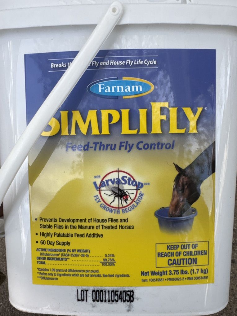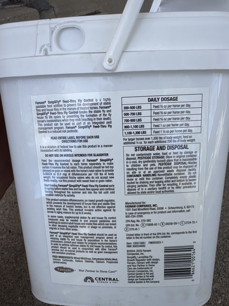 2, 3.75-lb buckets of awesome fly control supplement. Bought this winter for upcoming summer, but won’t have a need for it anymore.