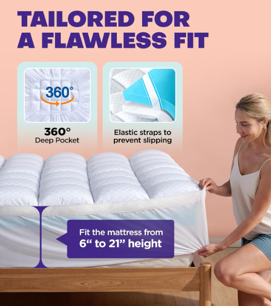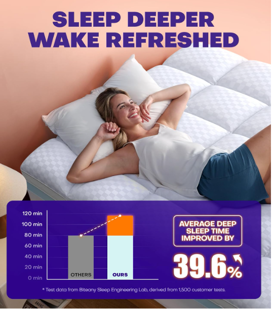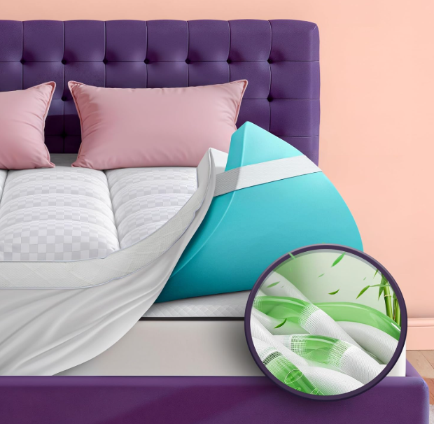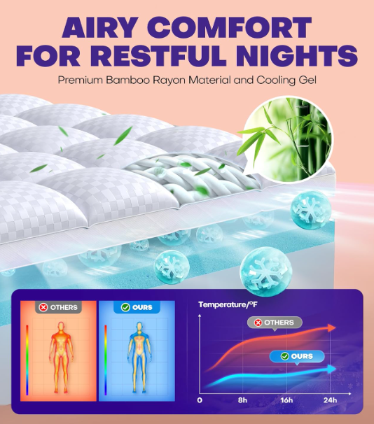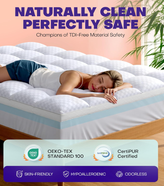 STAY COOL & SLEEP SAFE! The cooling mattress cover is crafted with 50% natural bamboo viscose , offering outstanding moisture-wicking and temperature-regulating performance. Designed to keep you cool, dry, and comfortable through the night, it helps eliminate heat buildup, stickiness, and night sweats. Made with TDI-free materials, our mattress pad ensures hypoallergenic and skin-friendly comfort. Certified by OEKO-TEX STANDARD 100 and CertiPUR-US, the topper provides verified safety and a healthy sleeping experience.