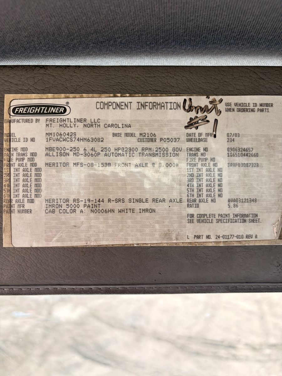 Year: 2004 Make: Freightliner Model: M2 106 Business Class Vac Truck Engine: Mercedes-Benz MB900 250hp w/Engine Brake Transmission: Allison Automatic Miles: 272001 showing Tires: 295/75 R 22.5 @ 60% VIN: 1FVACWCS74HM63082 Truck Detail: 26000lb GVWR, F-18000lbs R- 19000lbs, 5.86 Ratio, 191″ WB, Massport Pump, 2000 Gallon Tank – 500 Fresh Water, 1500Gallon Septic – includes hoses Dlr Stk# L26004