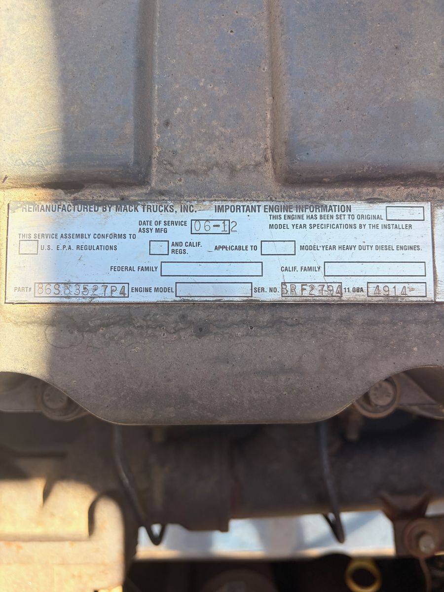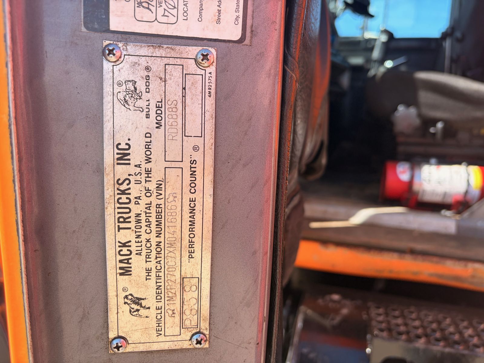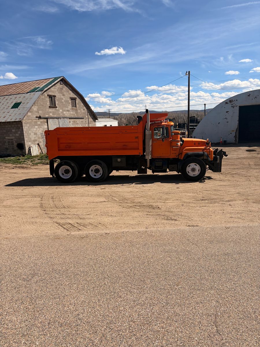 Year: 1999 Make: Mack Model: RD688S Engine: E7 Mack 400hp motor Miles: 346872 (Exempt on Title) Transmission: 18 Speed Transmission Tires: 11R 22.5 @ 60% VIN: 1M2P270C7XM041686 Detail: GVWR – 60000lb, F-20000lb, R- 40000lb, Mack Camelback Spring Suspension, 204″ Wheel Base, 14′ Dump Box, Sander, 12 Foot snow plow, Ex State Truck Dlr Stk#L25037