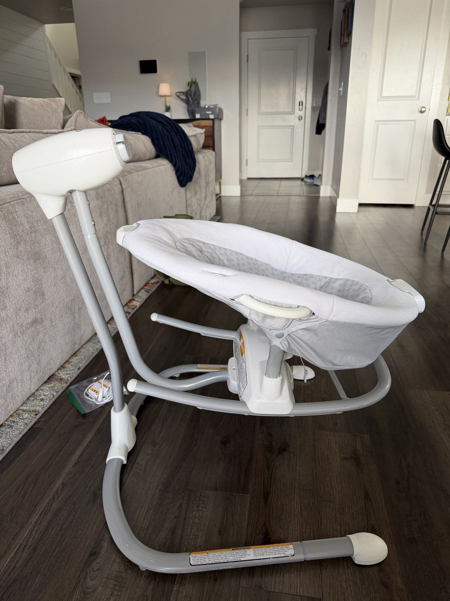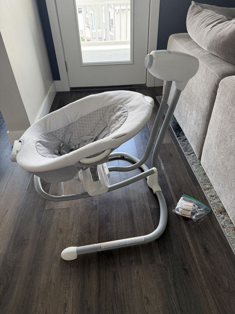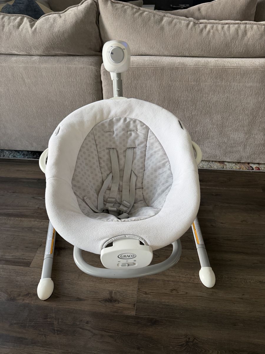 ZelleThis gently used Graco baby swing is in great condition and ready to keep your little ones safe and the sooth. It features a soft, supportive seat with a secure harness and multiple swing speed settings for customizable comfort. The sturdy frame is clean and stable and the included power adapter makes it easy to plug-in and use right away. Perfect for calming babies and giving parents a hands-free moment.