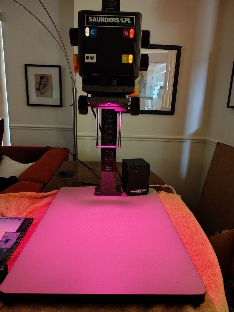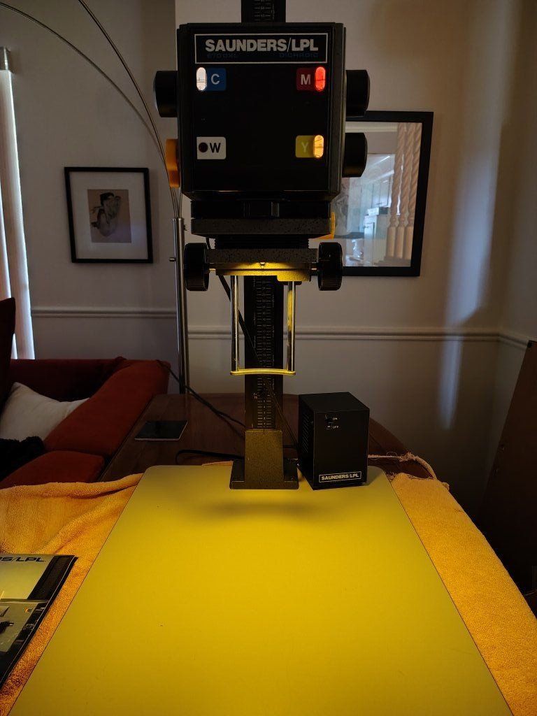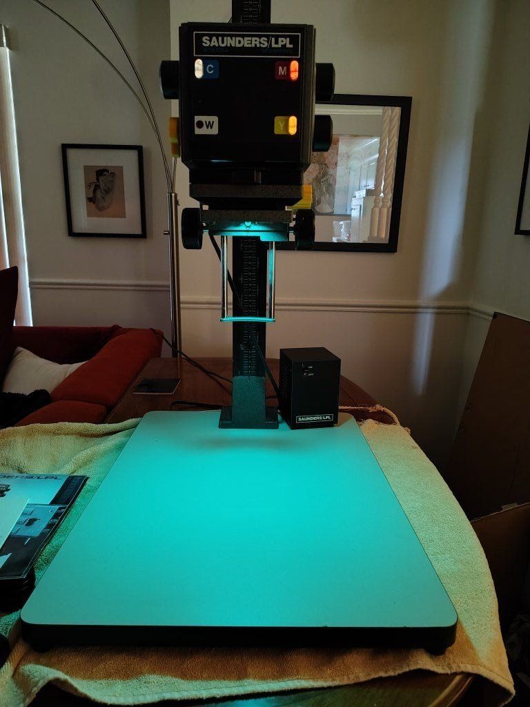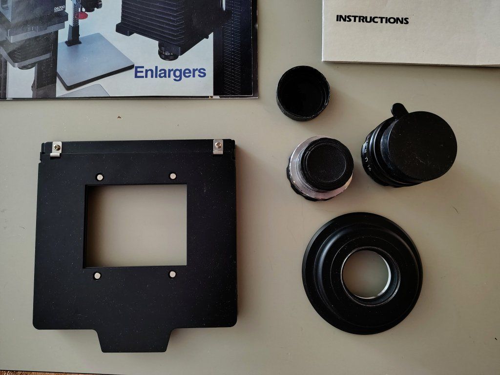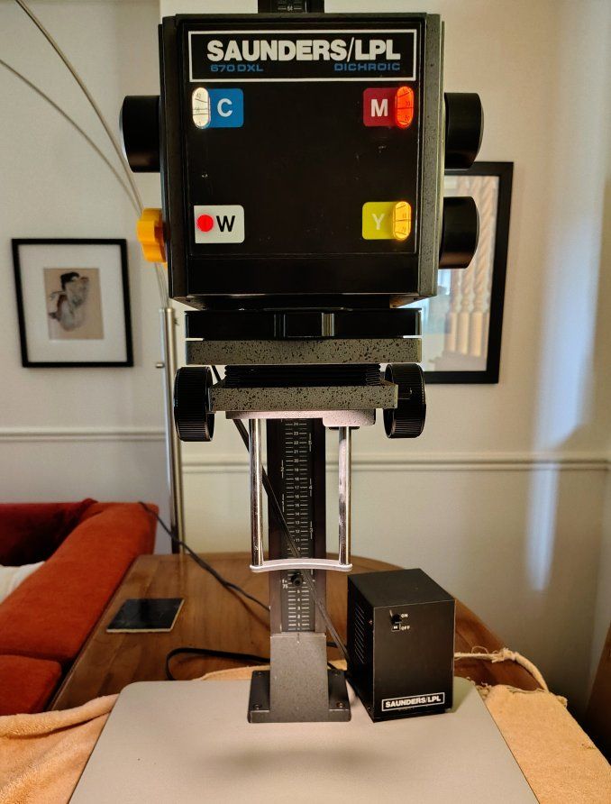 Color and black and white film Enlarger for photographic darkroom printing. This Enlarger can print 35mm and medium format film images. It's in great condition. The filter system is intact and working. All the knobs are in good working order also. Included are two good quality lenses for printing 35mm and medium format film images, a 6x7cm negative carrier, lens board, power supply, and manual. Film carriers for 6x6, 6x4.5, and 35mm can be purchased second-hand. Printing black and white is easy by adjusting the CMY color filters, or by using black and white contrast filters under the lens during exposure. This Enlarger even has a tilt shift control function. I really wish I had realized that sooner as I never tried it.