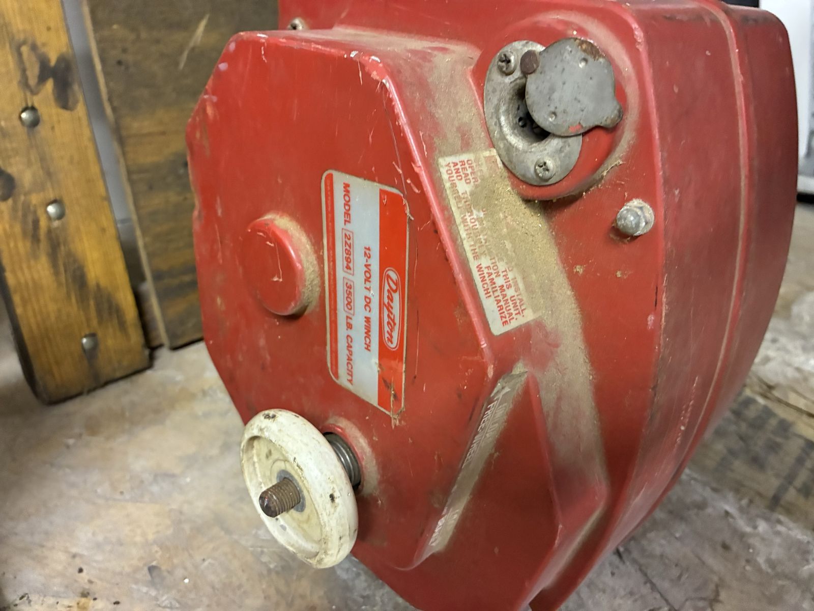 Venmo2 very used creepers, 2 hydrolic bottle jacks, and a Dayton electric winch, specifically model 2Z893. 12-volt DC, rated 2000 lbs.
