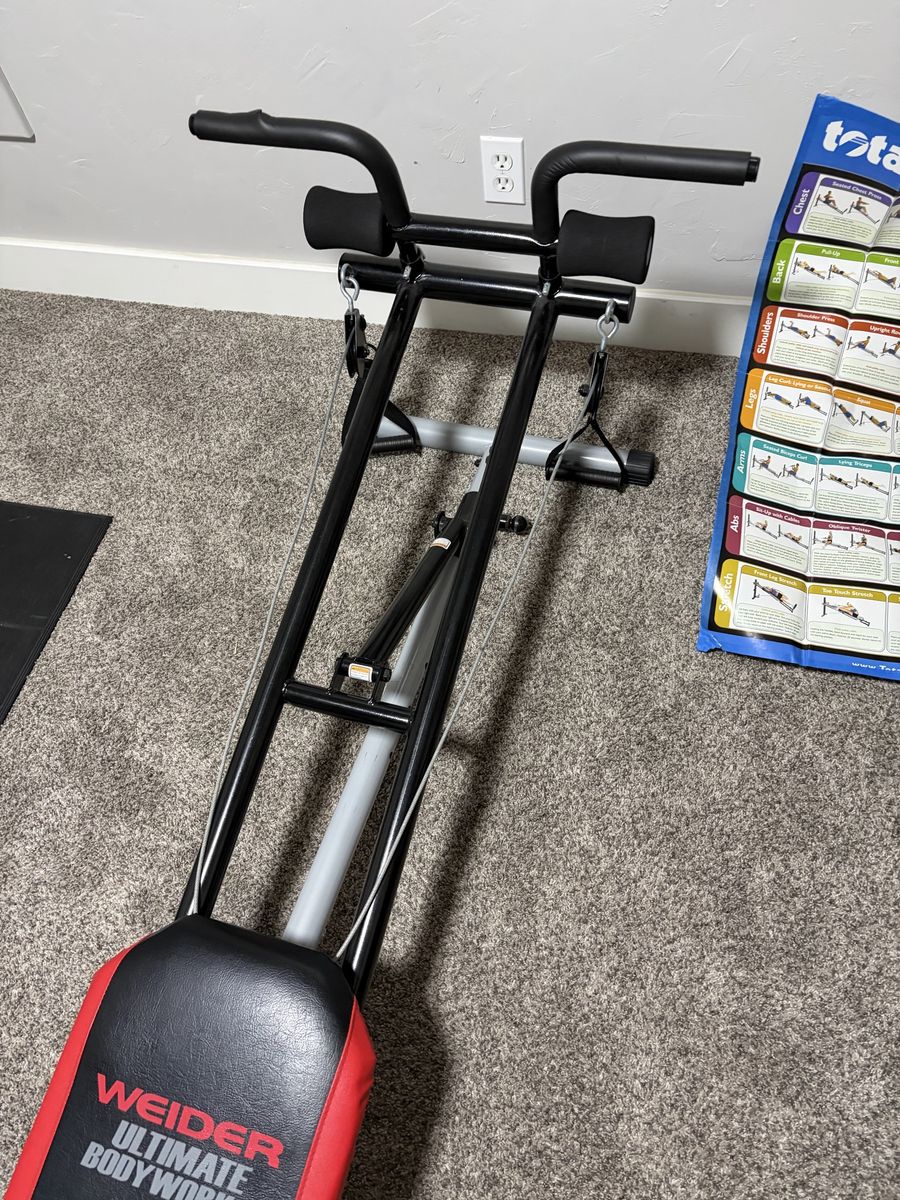 VenmoPulley and sled system for full body work out using your own body weight. Adjustable height and built in resistance bands. Easy to set up and easy to put away. No issues or damage. Works great. Will come with poster showing how to do different exercises.