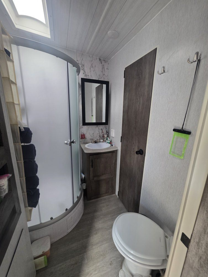 The "Why You Want This" Specs:The Garage: Plenty of room for your side-by-side, dirt bikes, or a very elaborate mobile craft room. If it has wheels and smells like gasoline, it’ll probably fit. The Kitchen: Features a stove that has seen exactly one pot of coffee and a fridge that is currently holding... nothing. It’s pristine. The Bathroom: It’s a real bathroom. No digging holes, no communal showers with strangers. Total privacy and great space for your morning meditations. The Exterior: Sleek, aggressive, and screams "I have cool hobbies," even if your only hobby is napping with the AC on.