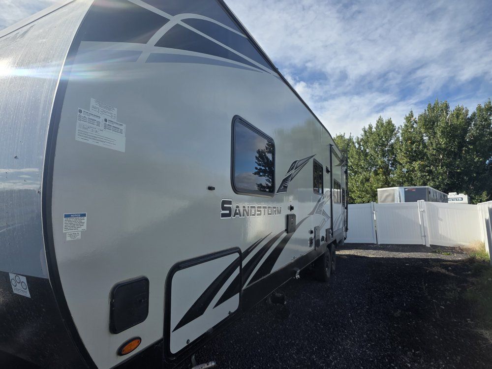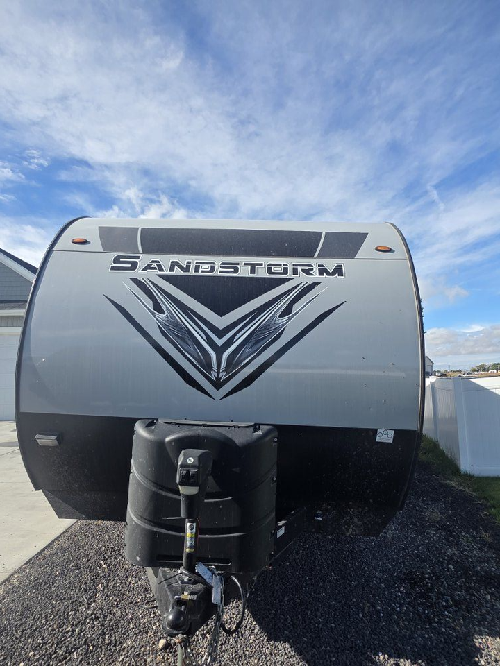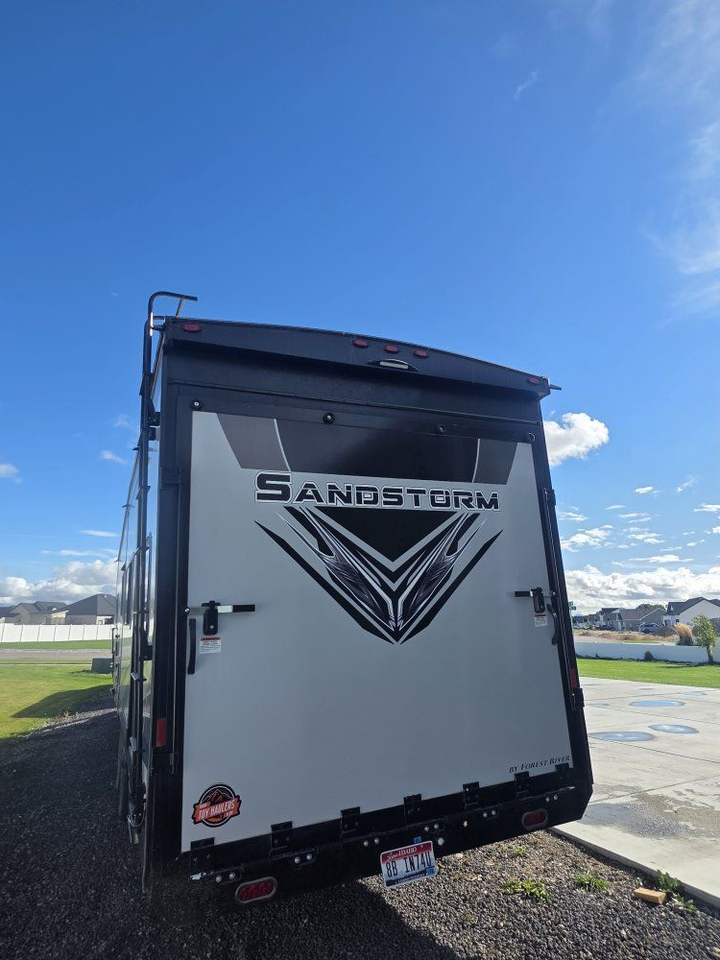Great toyhauler with good lay out. on board generator has 10.8hrs and 220watts of solar power equiped. very minimal usage. Happy jack bunk system, patio screen, electric stabilizer jacks couch pulls to a bed. 1 slide out. I do have interior pictures as well. feel free to text with any questions.Each Sandstorm toy hauler fifth wheel and travel trailer by Forest River features a 102" wide-body construction to bring along four-wheelers, dirt bikes, or kayaks! You will find convenient amenities, such as 220 watts of solar power and a regulator with power boost, a 35 gallon fuel station, an outside shower to wash off your gear, and more. There is also a power awning with LED lights outdoors to create an outdoor living space, plus heated and enclosed tanks to camp all year long. The interior includes LED accent lighting, black night shades throughout, and a glass shower to name a few comforts. And don't overlook the available options that can added to customize your toy hauler just the way you like it! located near Rigby ID Sleeps6-7Slides1Ext Width8 ft 6 inHitch Weight1135 lbsGVWR10995 lbsDry Weight 8083 lbsFresh Water Capacity140 galsGrey Water Capacity 65 gals Black Water Capacity40 galsTire Size15"Furnace BTU30000 btuFuel Capacity 35 gals Bunks Queen bed Refrigerator Type Double Door Refrigerator Size8 cu ft Cooktop Burners3 Axle Weight 5100 lbs Garage Size15 ft 11 inLP Tank Capacity30 lbs Water Heater Capacity10 gal Water Heater Type Quick Recovery Gas/Electric DSIAC BTU13500 btu Awning Info16' Electric with LED