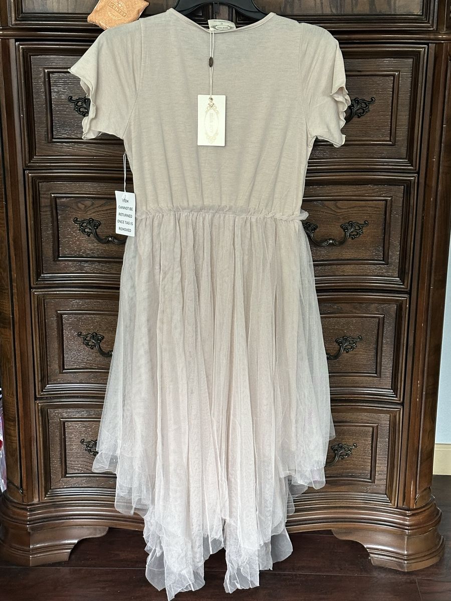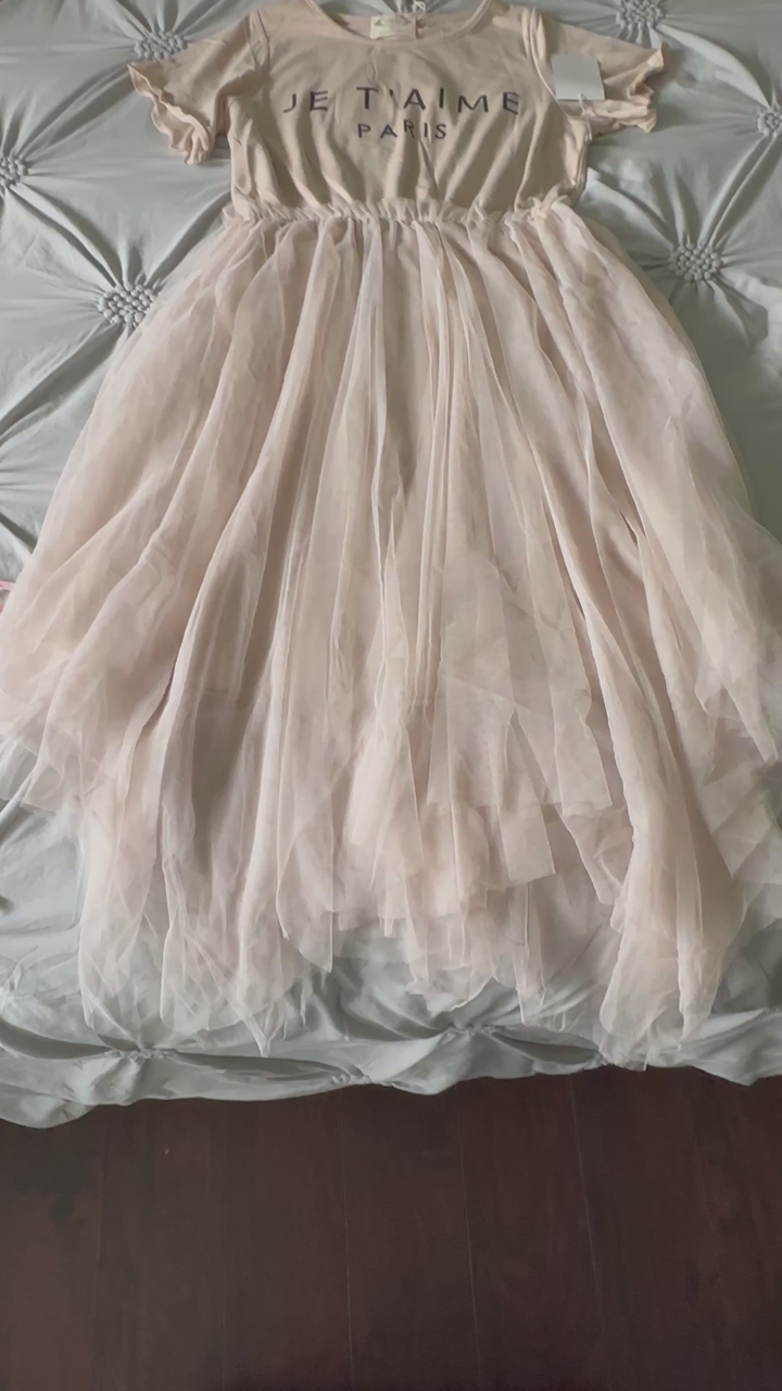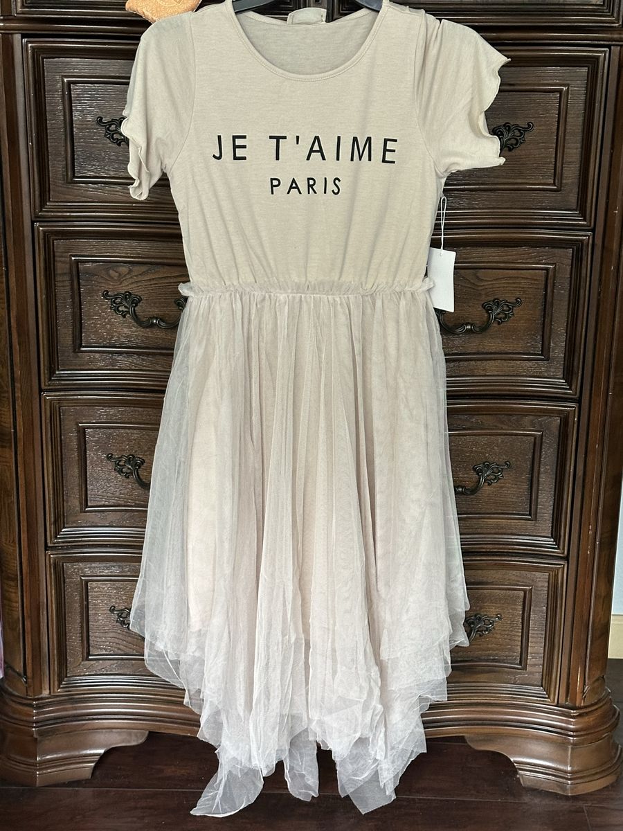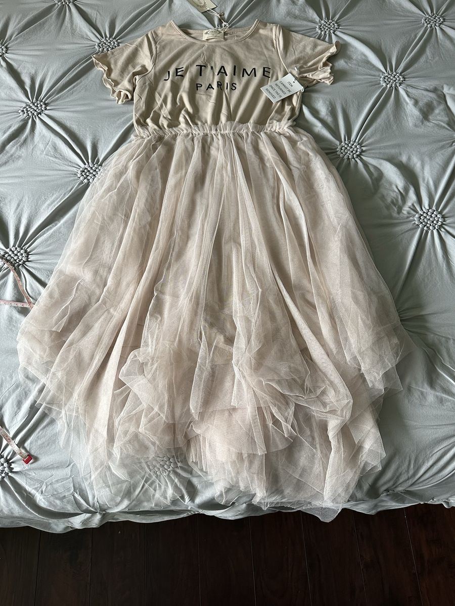 Mia Joy Joyfolie Feya Je T'amie Paris Midi Dress in Sand Tan Knit and Tulle. Add a touch of whimsy to her wardrobe with our charming high-low midi dress. A playful petticoat skirt with a ruffle gives the dress a fun, voluminous silhouette. The dress is fully lined for extra comfort and coverage. Perfect for any special occasion, this dress combines elegance and charm in one stunning piece. 100% Polyester Asymmetrical Hem Petticoat Skirt, Fully Lined, Size: Girl's 12. This is the Feya Dress in Sand (Size 12) from Joyfolie. The Feya dress typically features a soft jersey knit bodice and a voluminous, multi-layered tulle skirt with an asymmetrical handkerchief hemline. The "Sand" colorway specifically features a graphic "JE T'AIME PARIS" print on the top.