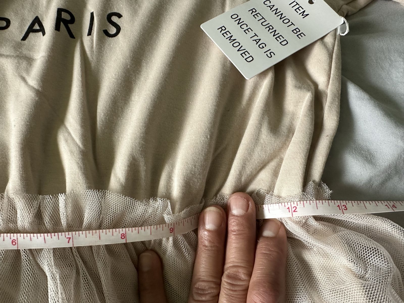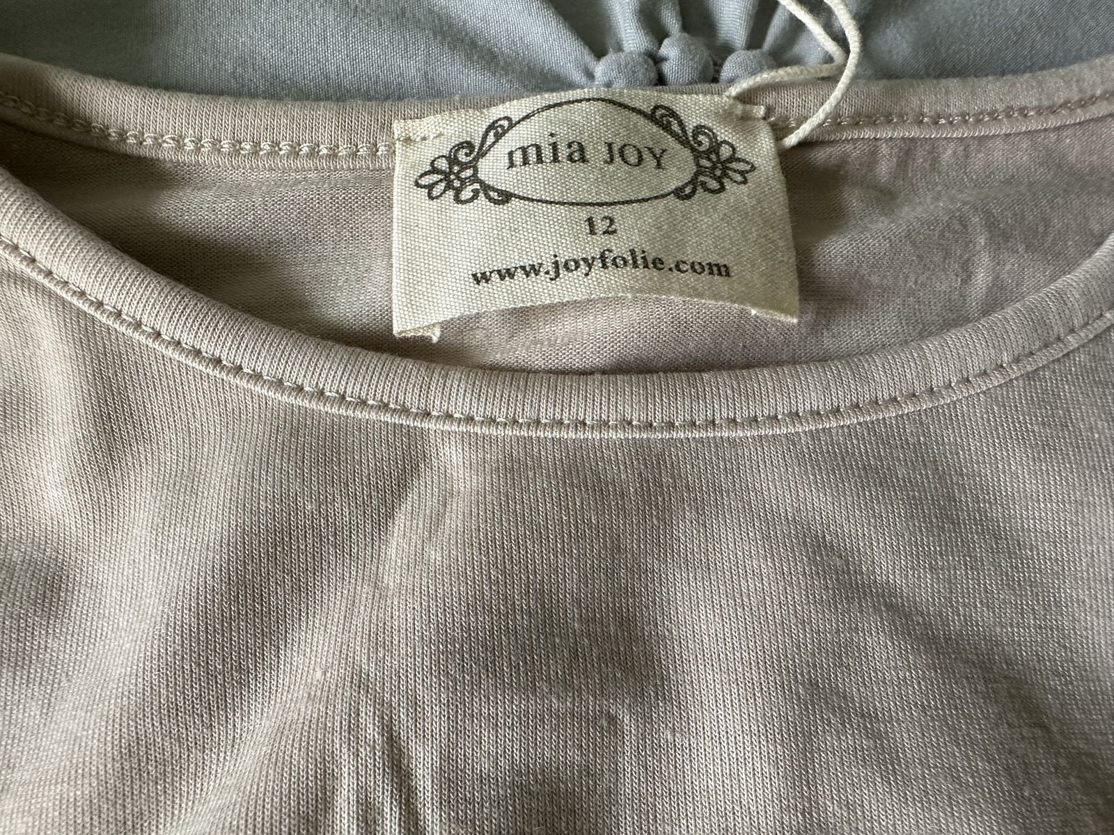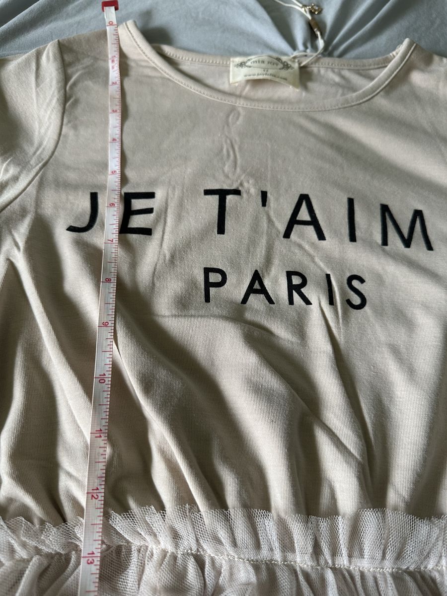 Mia Joy Joyfolie Feya Je T'amie Paris Midi Dress in Sand Tan Knit and Tulle. Add a touch of whimsy to her wardrobe with our charming high-low midi dress. A playful petticoat skirt with a ruffle gives the dress a fun, voluminous silhouette. The dress is fully lined for extra comfort and coverage. Perfect for any special occasion, this dress combines elegance and charm in one stunning piece. 100% Polyester Asymmetrical Hem Petticoat Skirt, Fully Lined, Size: Girl's 12. This is the Feya Dress in Sand (Size 12) from Joyfolie. The Feya dress typically features a soft jersey knit bodice and a voluminous, multi-layered tulle skirt with an asymmetrical handkerchief hemline. The "Sand" colorway specifically features a graphic "JE T'AIME PARIS" print on the top.