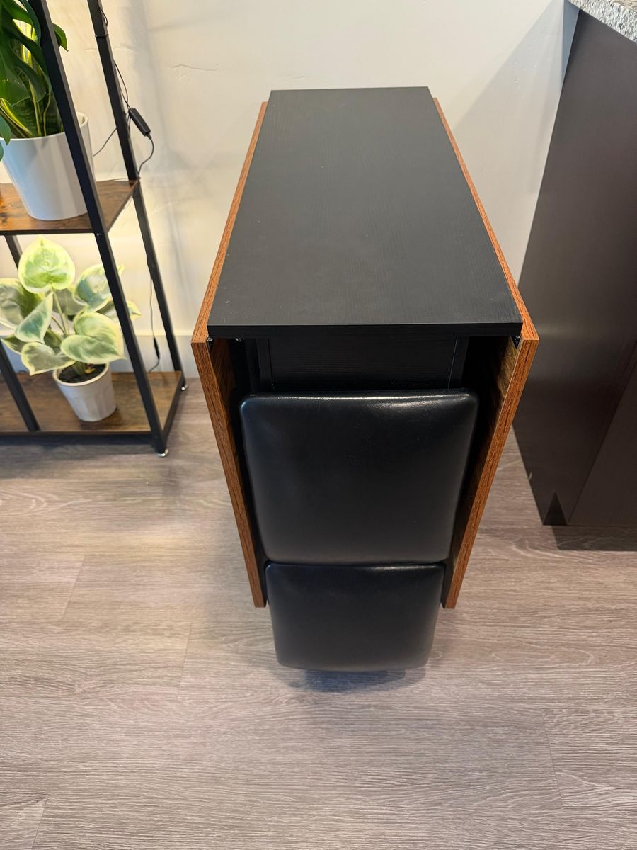 ApplePaykitchens. This clever drop-leaf table folds down to just a few inches wide when not in use. The two matching black stools tuck neatly inside the frame for a completely "hidden" footprint. • Design: Two-tone (Black and Rustic Wood). • Versatility: Use it as a console table, a desk, or a full dining table for two. • Included: Table + 2 compact stools.