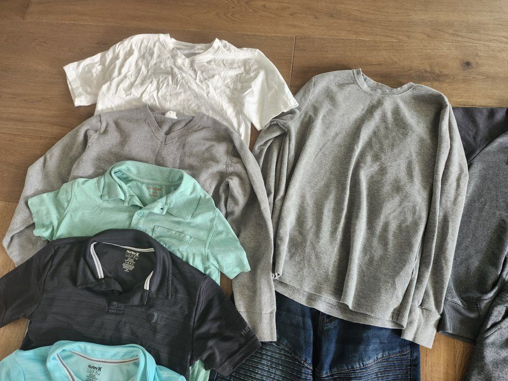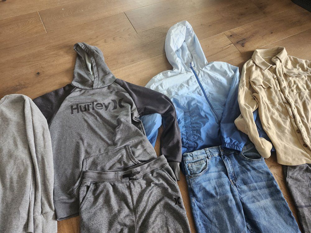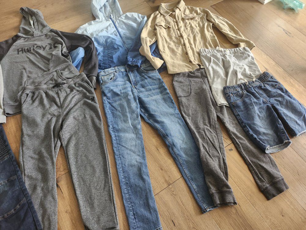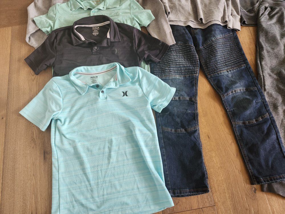 1 GAP Windbreaker, blue Hurley hoodie and pants (never warn) 1 Ring of Fire Slim Moto Jeans (never warn) 1 Oshkosh Skinny Jean (never warn) Aqua Blue Hurley Polo Black Hurley Polo Gray RSQ long sleeve White French Toast Vneck Tshirt Gray GAP Vneck Sweater Green Cat & Jack Polo Khaki Waffle Button up shirt Dark Gray sweat pants Gray shorts GAP jean shorts (never warn)