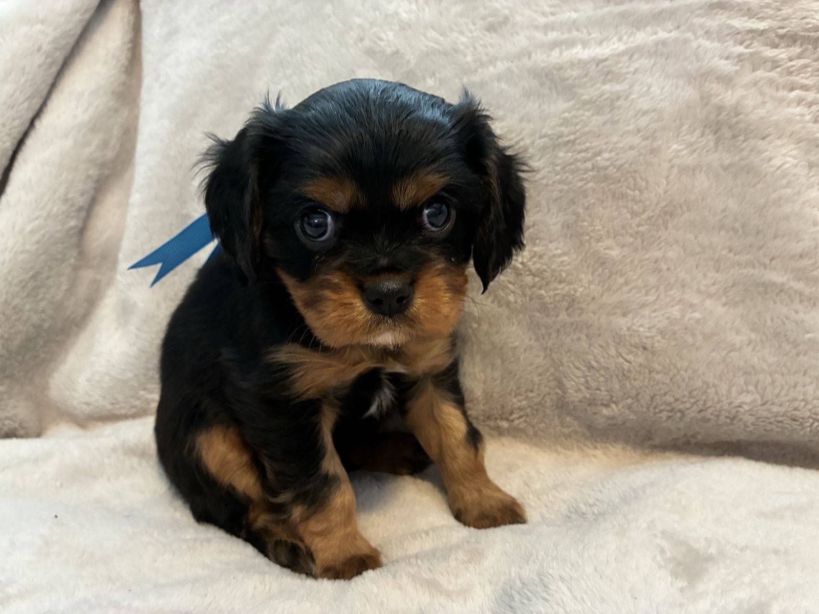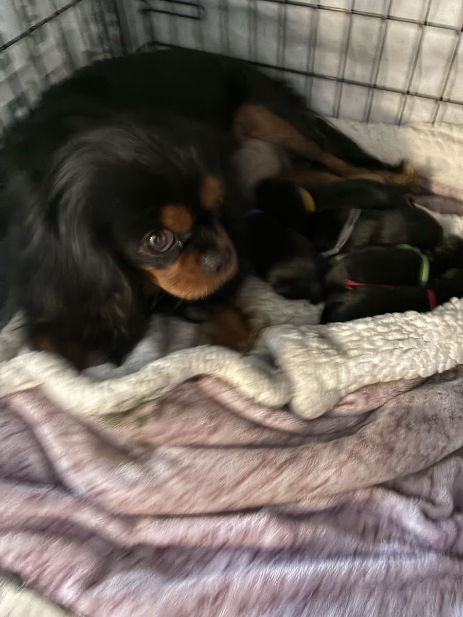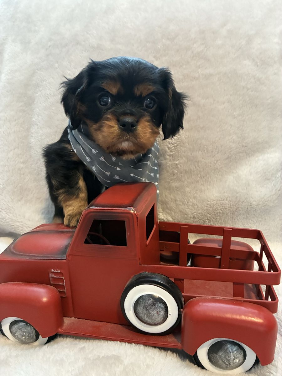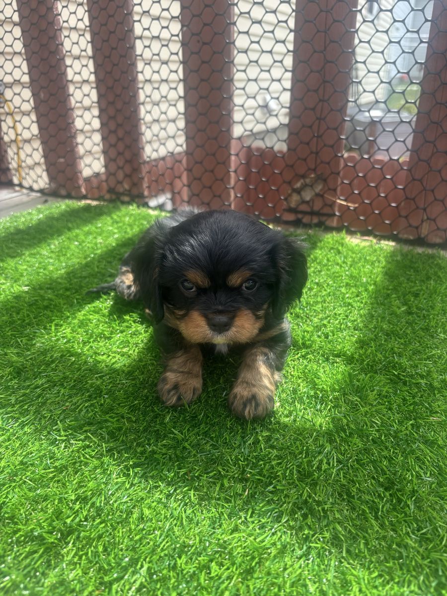 His mom is an AKC petite, beautiful black and tan cavalier weighing 14 lbs. Dad is an AKC chocolate tri cavalier weighing 14 lbs. Irish is tracking to be on the smaller side, weighing 12 lbs. Last three pictures are of the mom and dad.