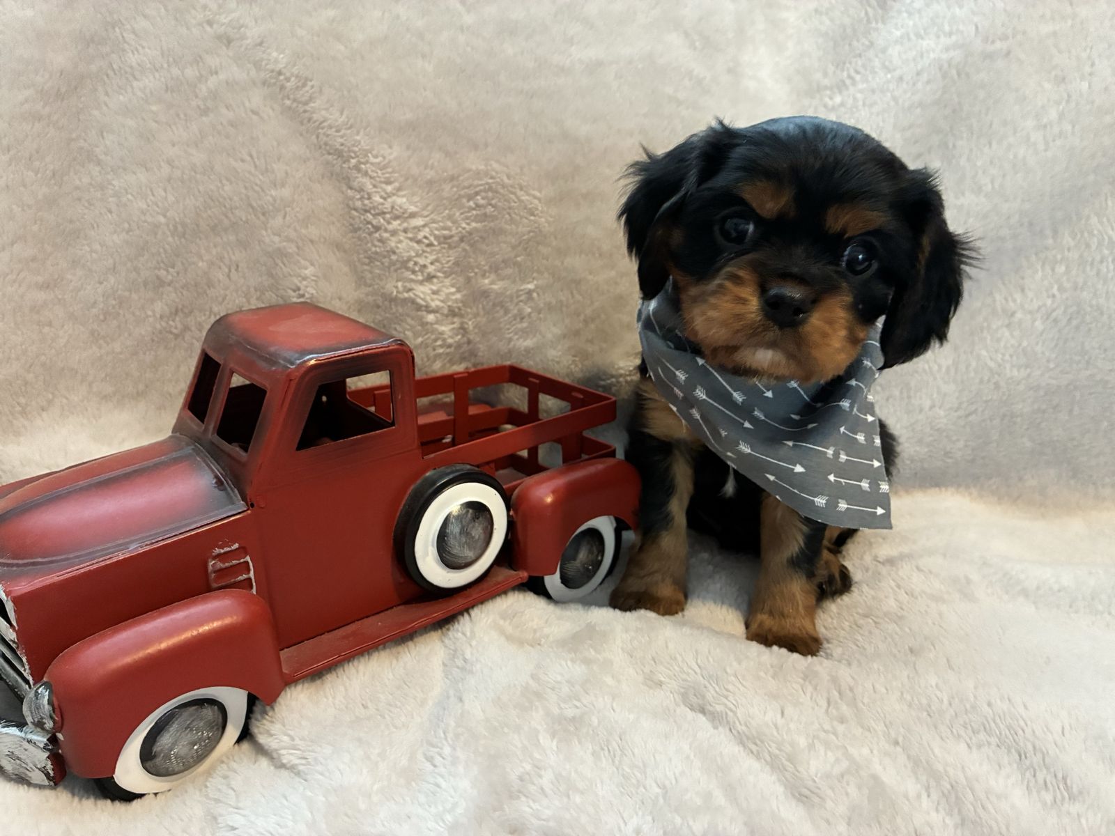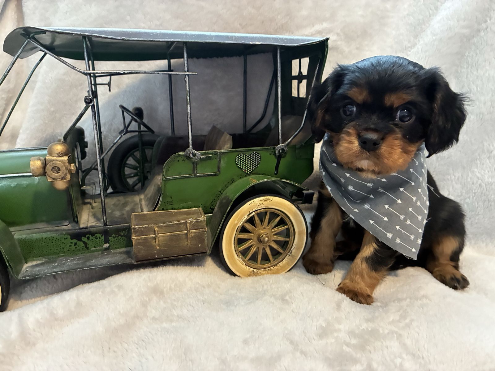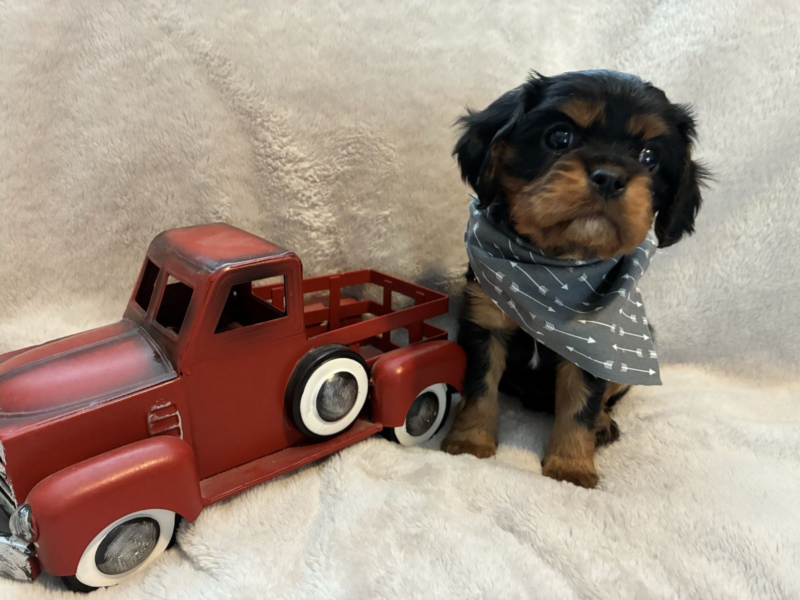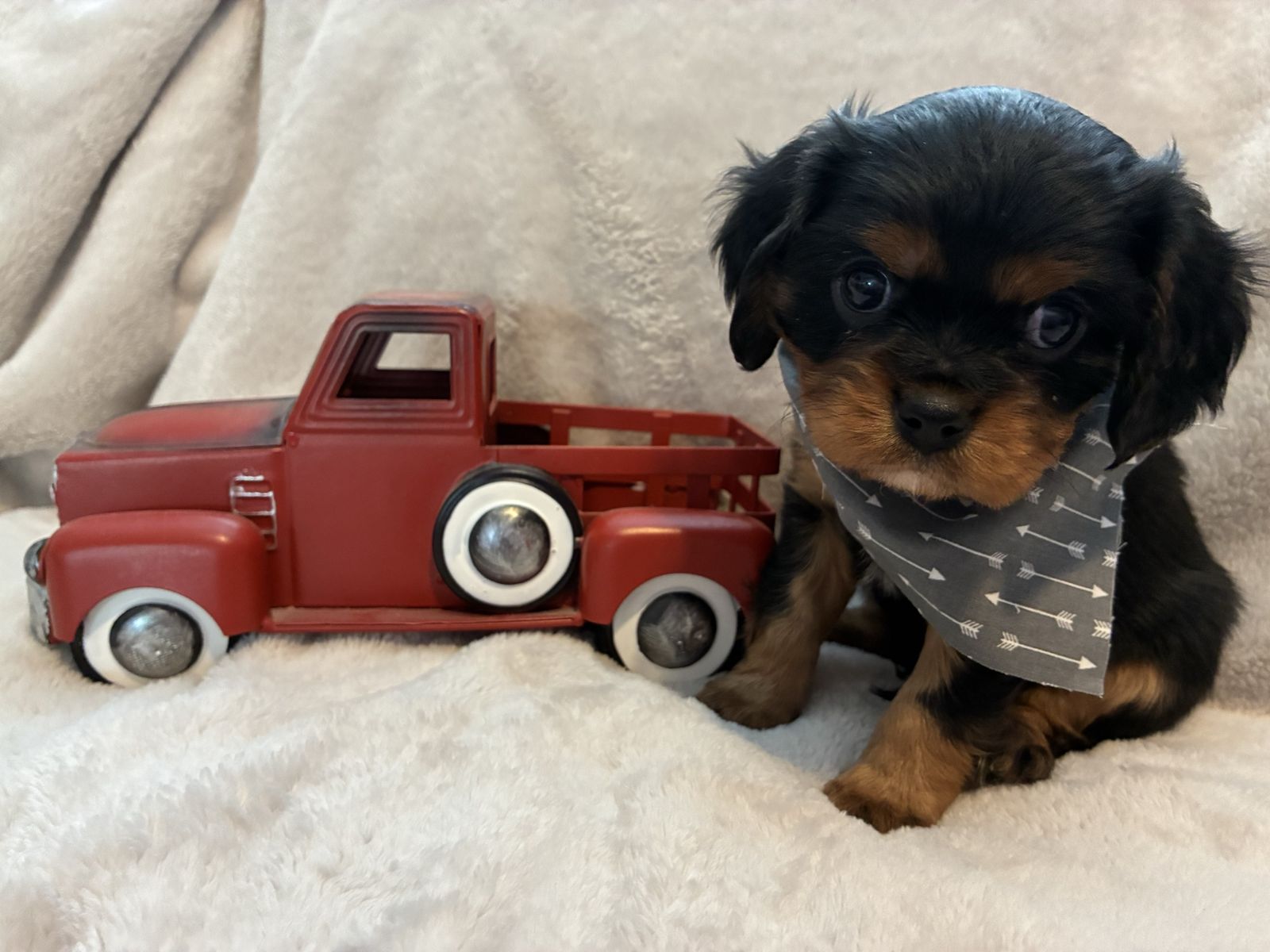 His mom is an AKC petite, beautiful black and tan cavalier weighing 14 lbs. Dad is an AKC chocolate tri cavalier weighing 14 lbs. Irish is tracking to be on the smaller side, weighing 12 lbs. Last three pictures are of the mom and dad.