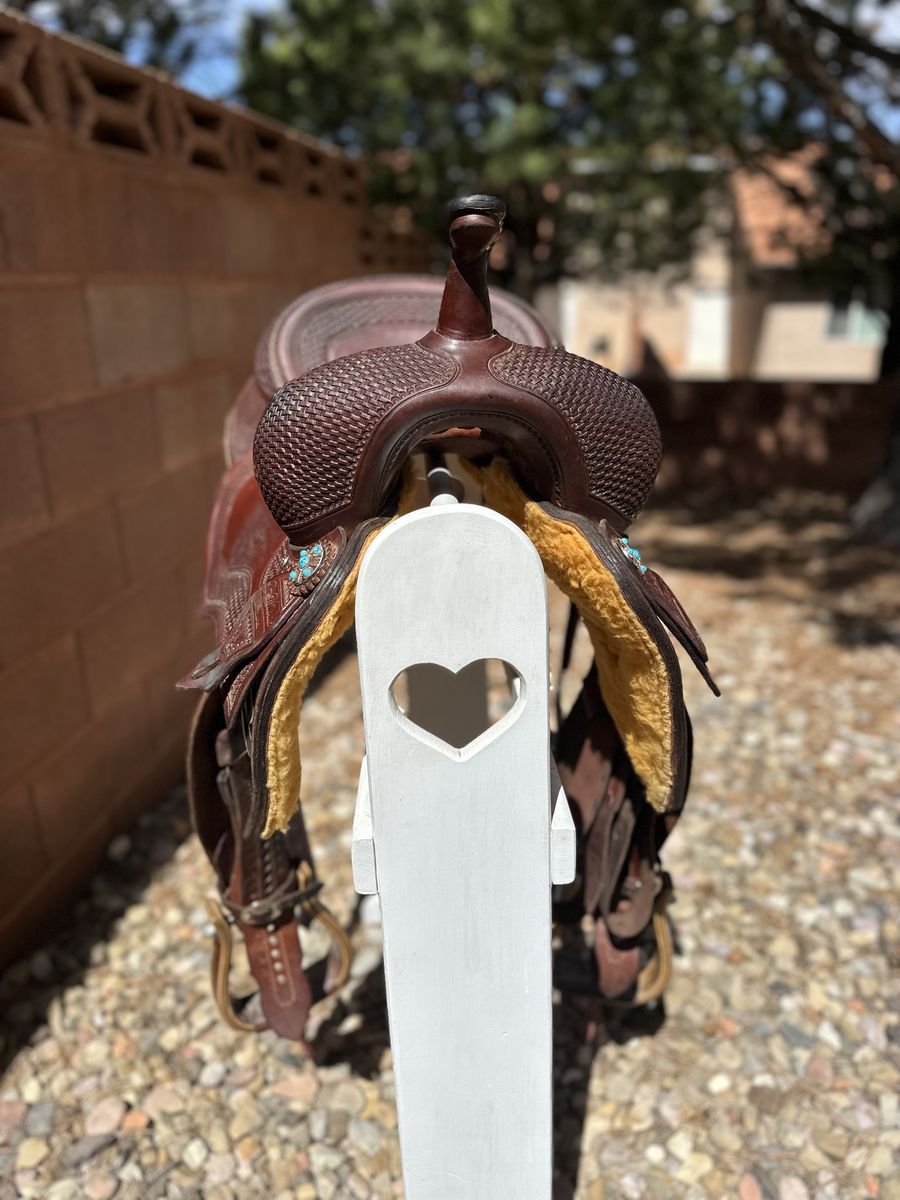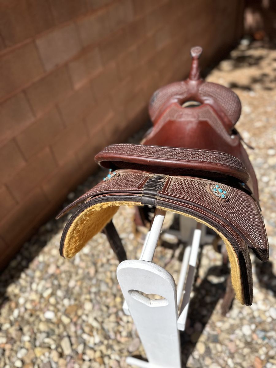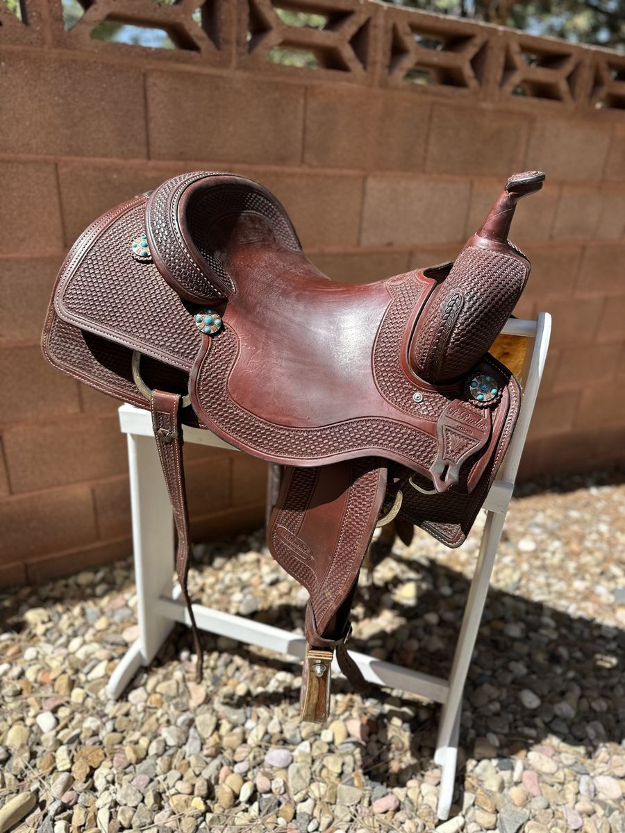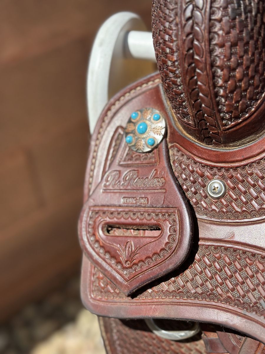 ApplePay16 inch R. Ruelas Cutting Saddle. Herman Oak Latigo leather with basket stamp and 2 inch wooden stirrups. Custom turquoise stone conchos. This saddle has been rode in for about 1 month then kept inside the house on a rack to keep safe. Most comfortable saddle I've ever owned! I dont work with cutting horses anymore. Ask any questions!