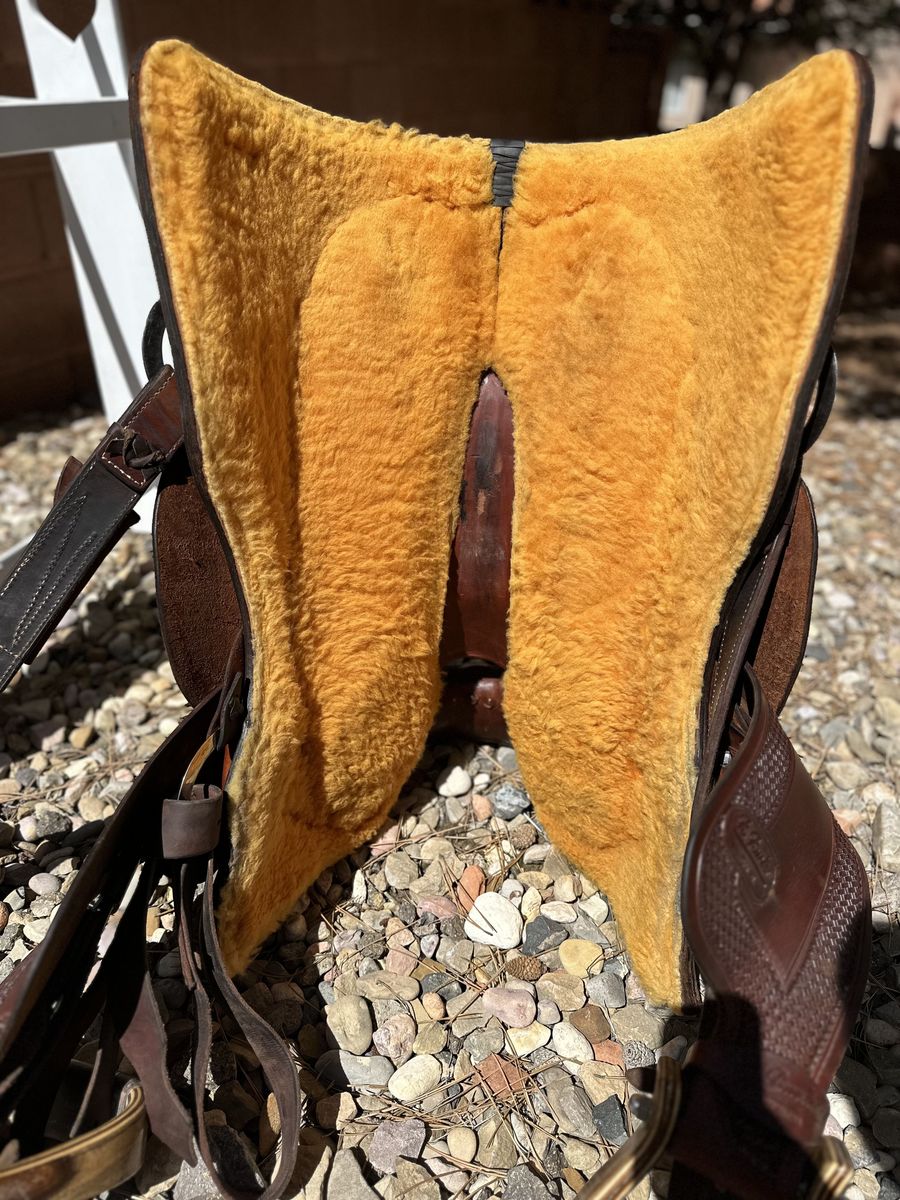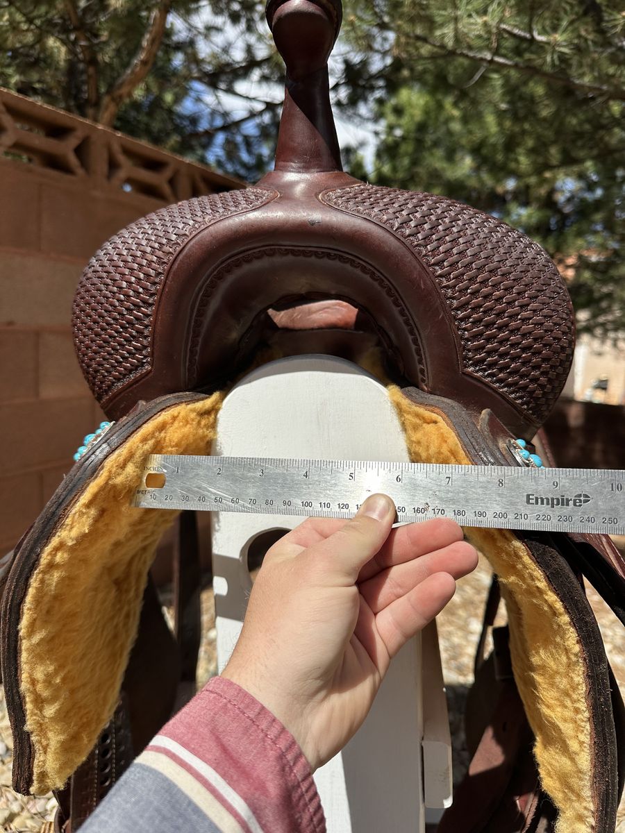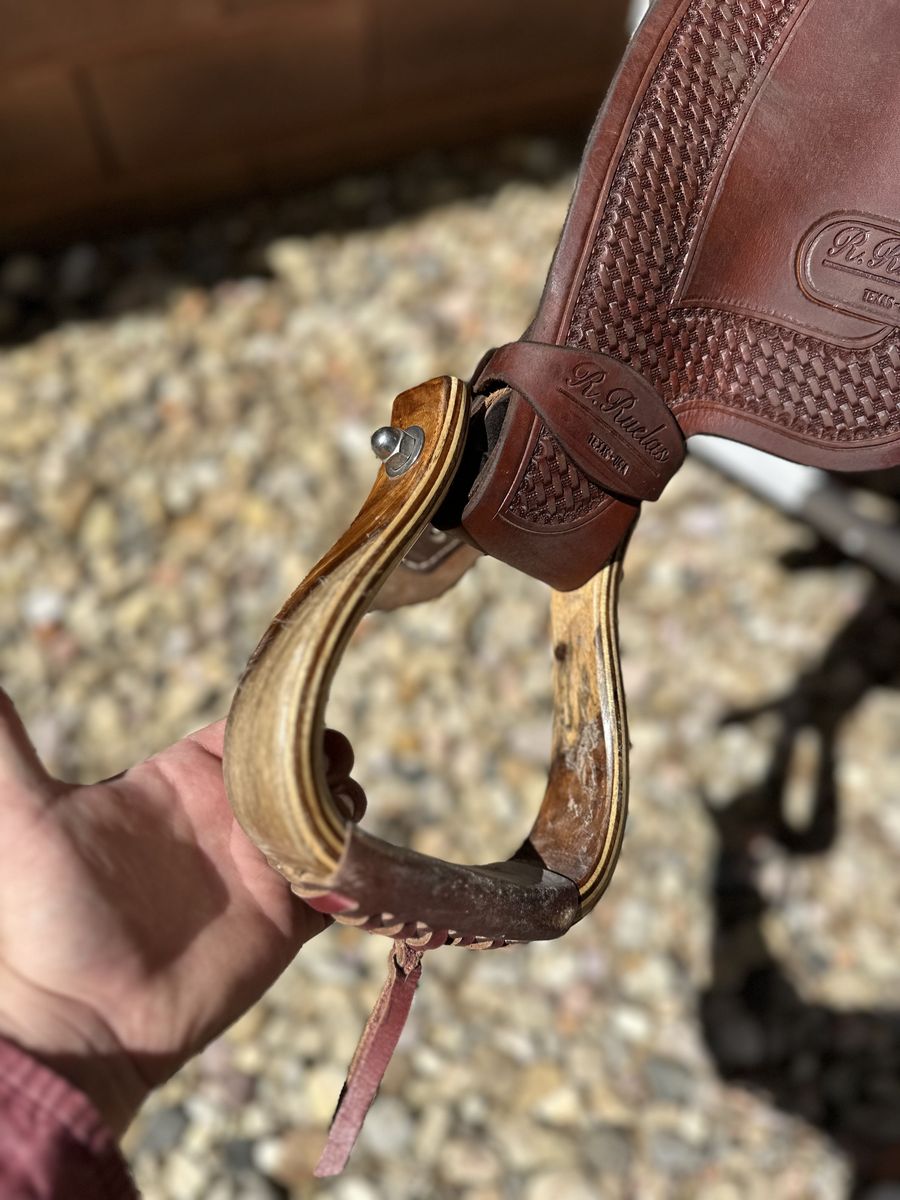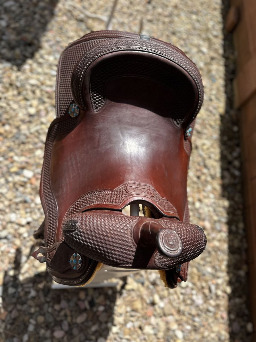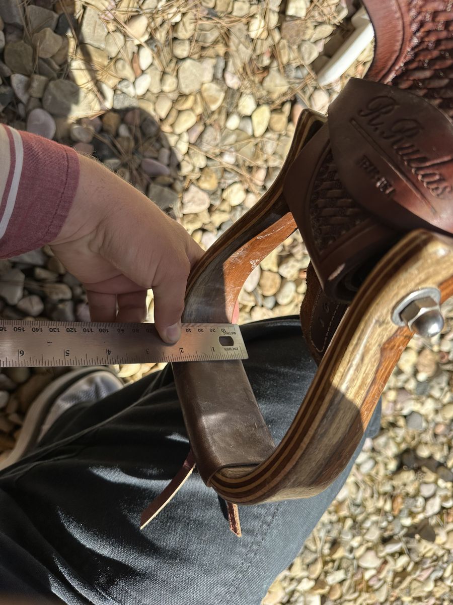 ApplePay16 inch R. Ruelas Cutting Saddle. Herman Oak Latigo leather with basket stamp and 2 inch wooden stirrups. Custom turquoise stone conchos. This saddle has been rode in for about 1 month then kept inside the house on a rack to keep safe. Most comfortable saddle I've ever owned! I dont work with cutting horses anymore. Ask any questions!