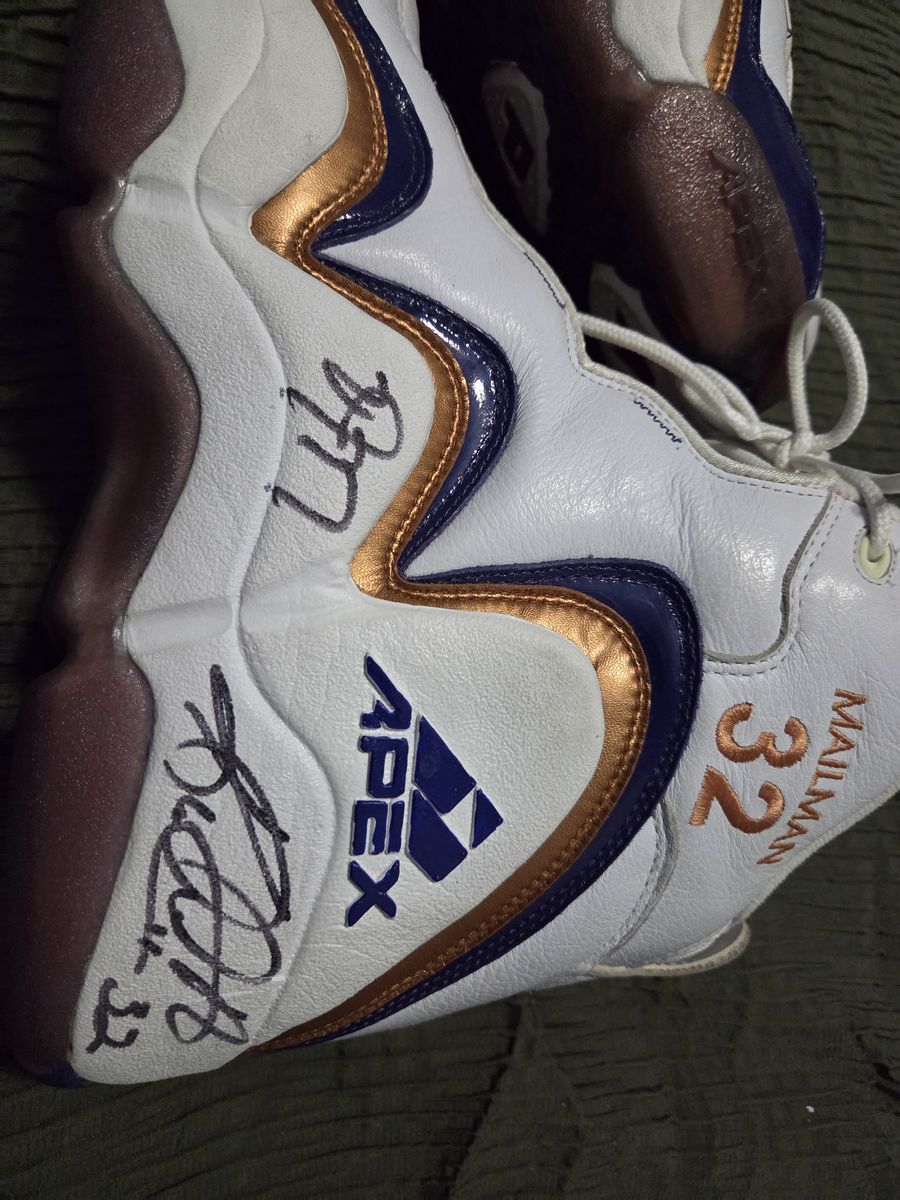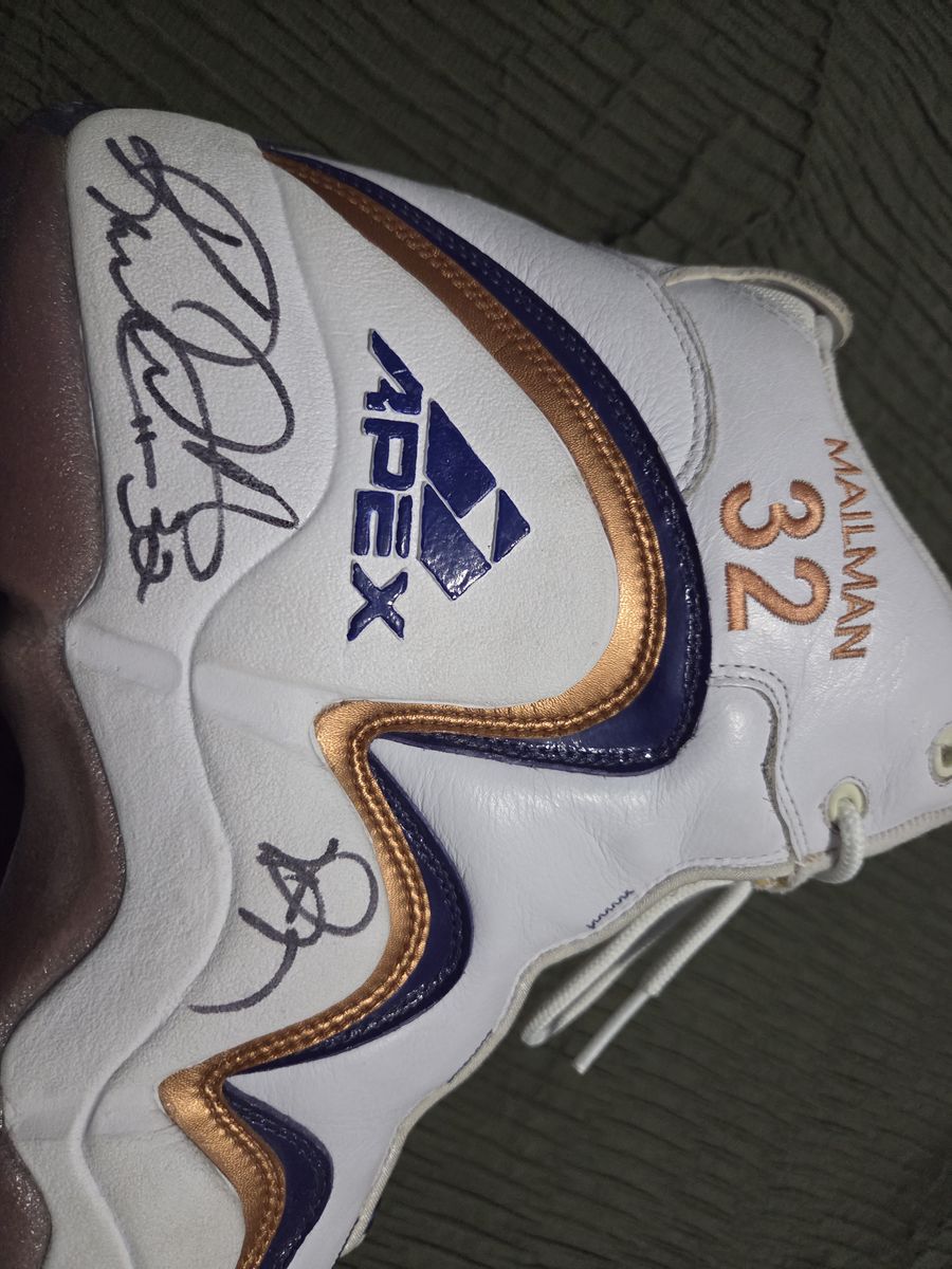 Karl Malone game worn shoes, his PE MVP shoes , great condition no cracking and beautiful auto with a utah jazz inscriptions
