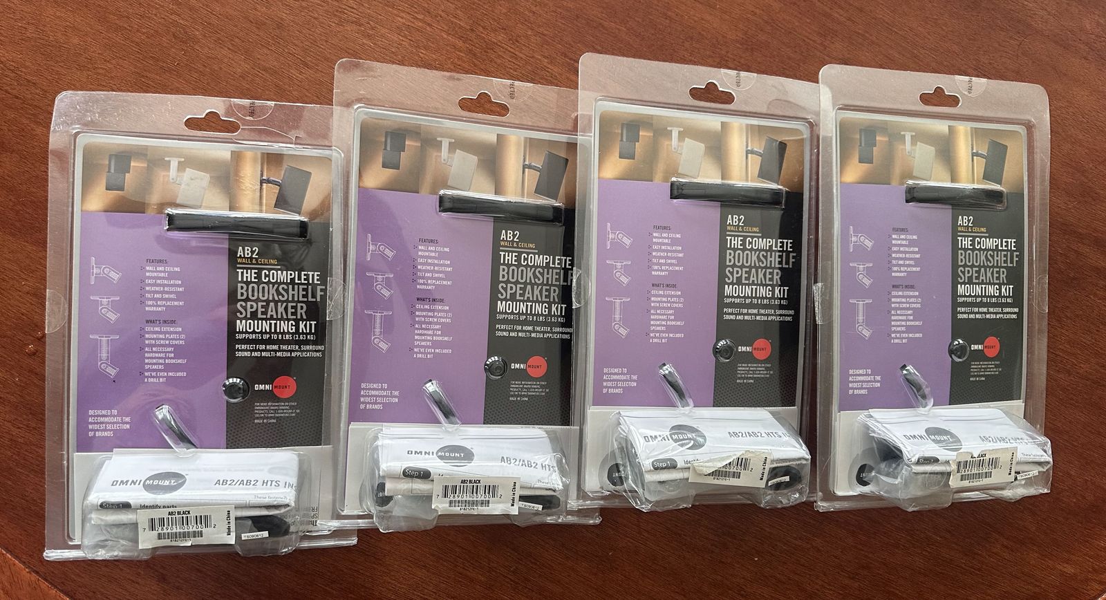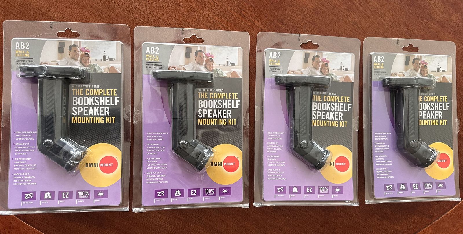 VenmoComplete Bookshelf Speaker Mounting Kit AB2 Wall & Ceiling Mount - brand new, unopened and unused, 4pcs available for home theater wall or ceiling mounts, up to 8 lbs per speaker. An example was shown in the last picture with a (Infinity 5.1) rear speaker mounted (just as a demon not for sale).