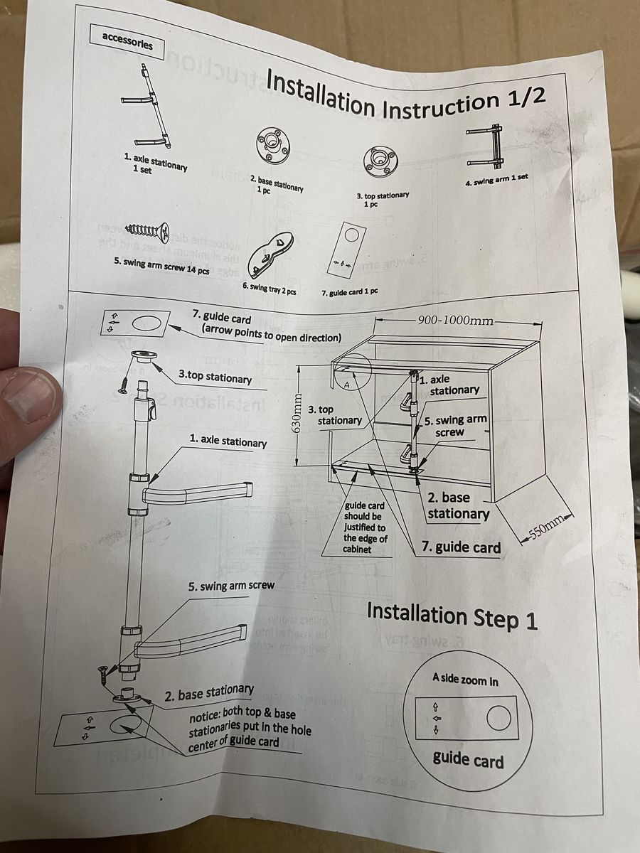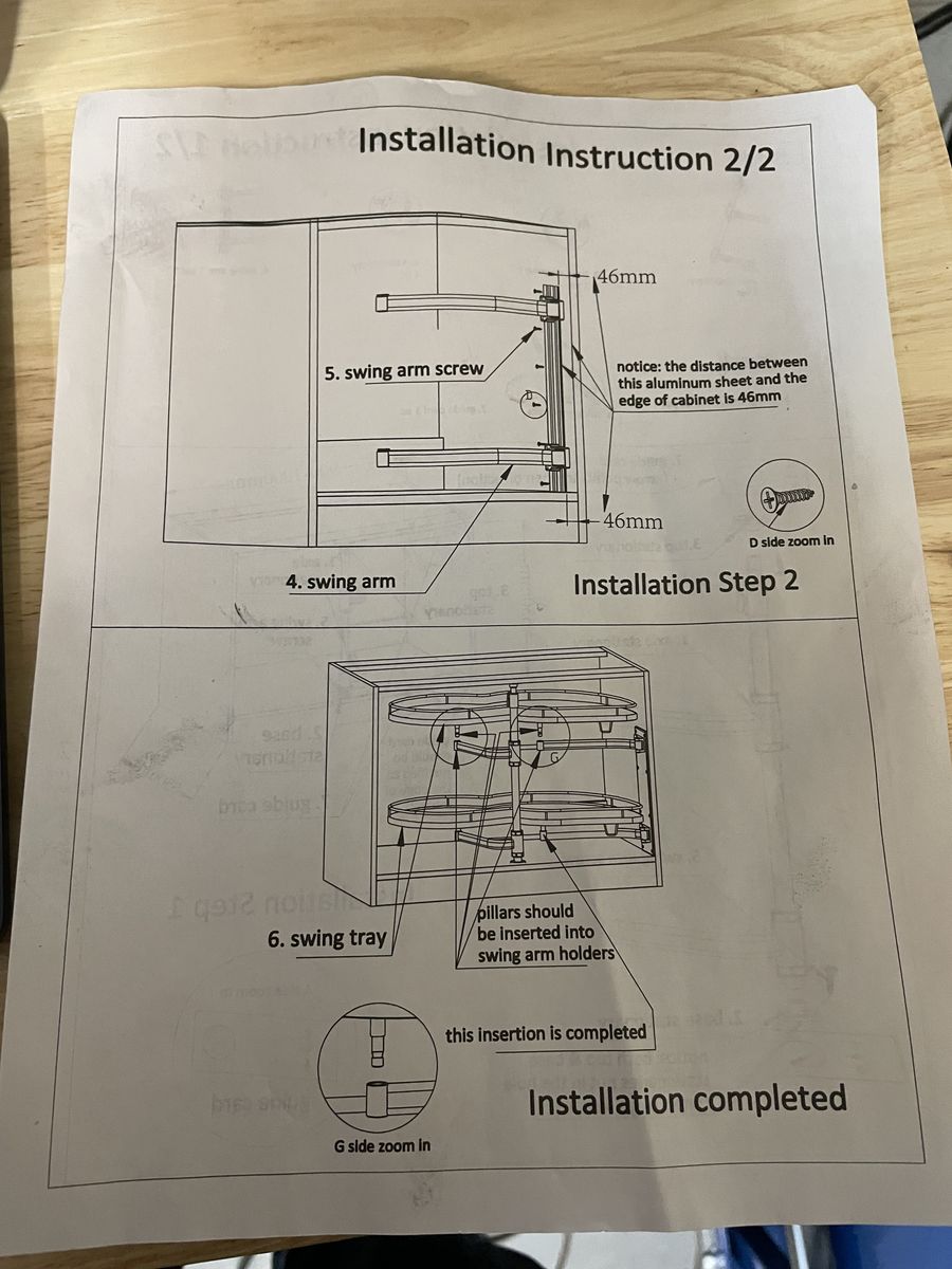 VenmoItem is new and in undamaged condition. May be open box and may not be in original manufacturer packaging. VEVOR brand lazy susan set for corner kitchen cabinets. Includes rotating tray (~33" diameter), swing arms, mounting hardware, and installation instructions. All pieces appear to be present.