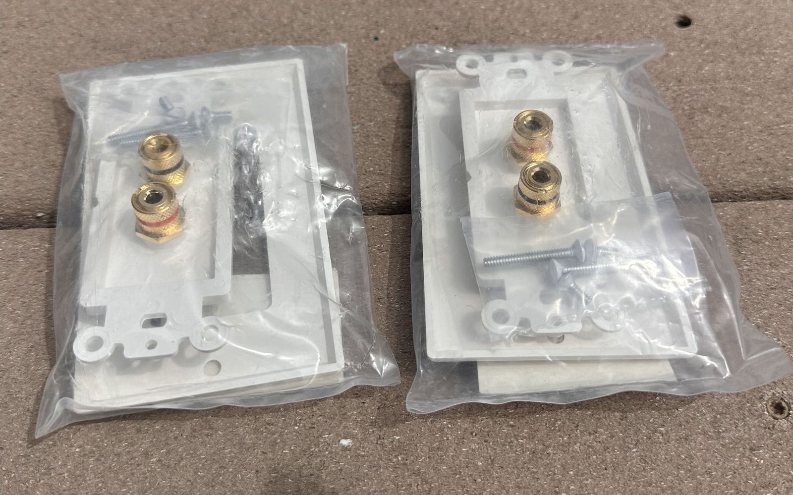 Venmo2pc (a pair), white MONOPRICE 3324 speaker banana plug or bare wire wall connect, New, Unopened. As a demo (not for sale), the last picture shows how it is used for a speaker connection through wall. Cash or Venmo only.