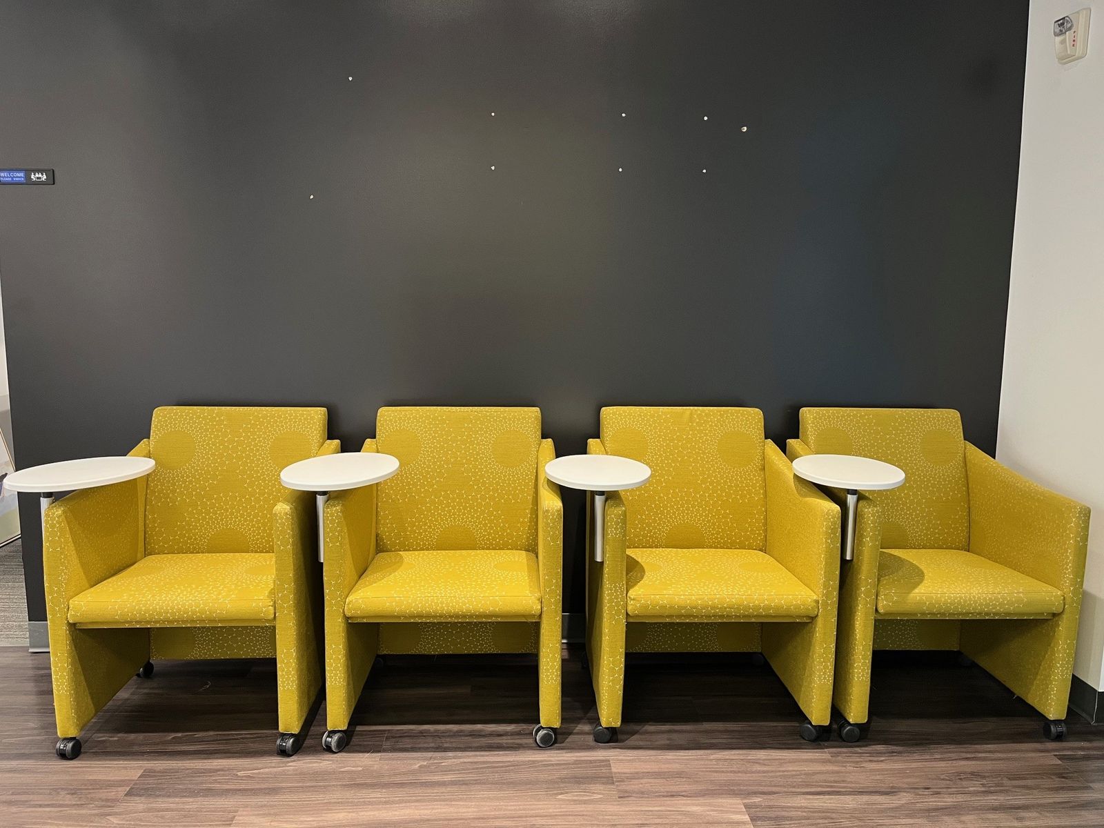 VenmoSet of 4 Herman Miller lounge chairs in bold yellow/gold upholstered fabric with a subtle dot pattern. Each chair includes a round white swivel tablet arm and casters for easy repositioning. Good condition, manufactured 2015. Perfect for a waiting room, clinic, or office lounge. Sold as a set of 4 for $850 OBO, or $225 each.