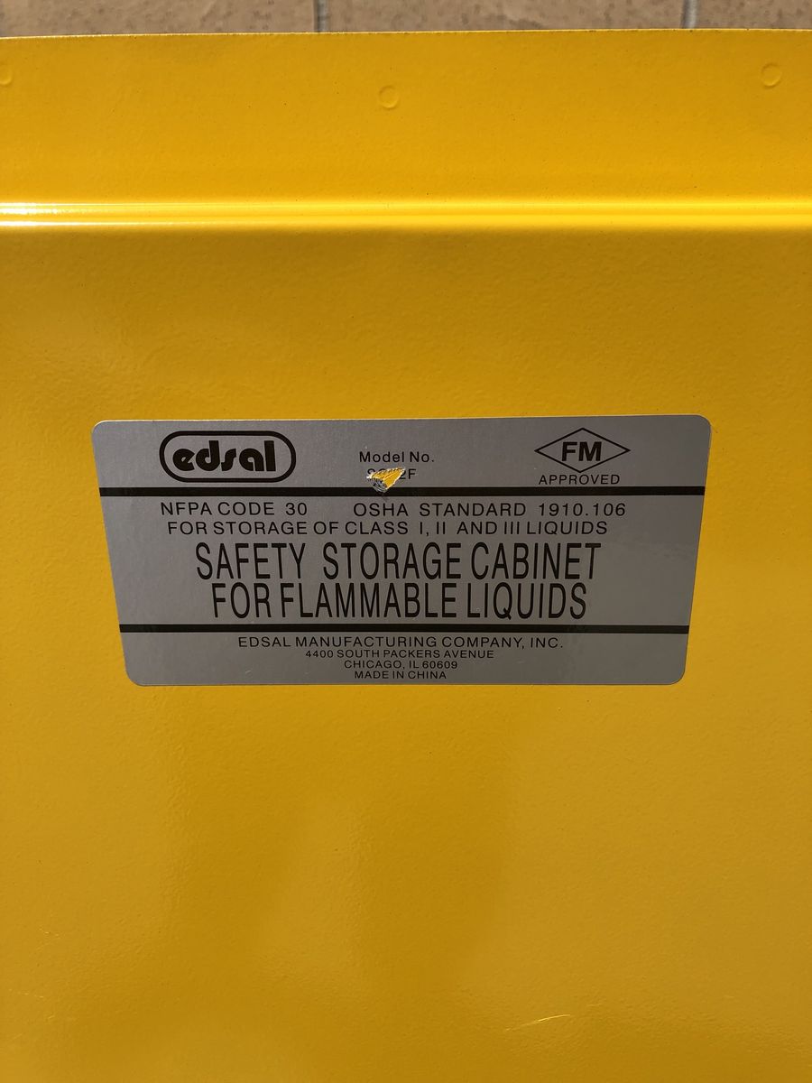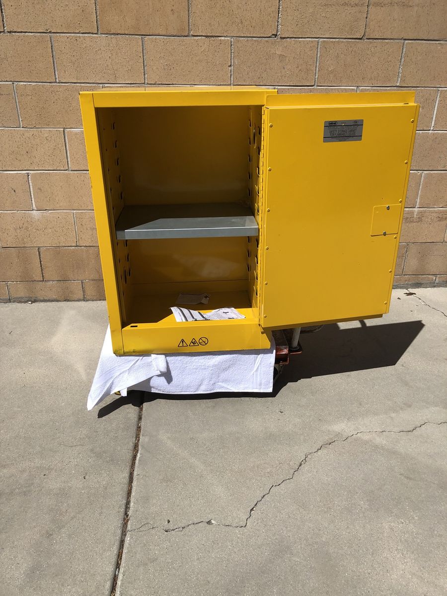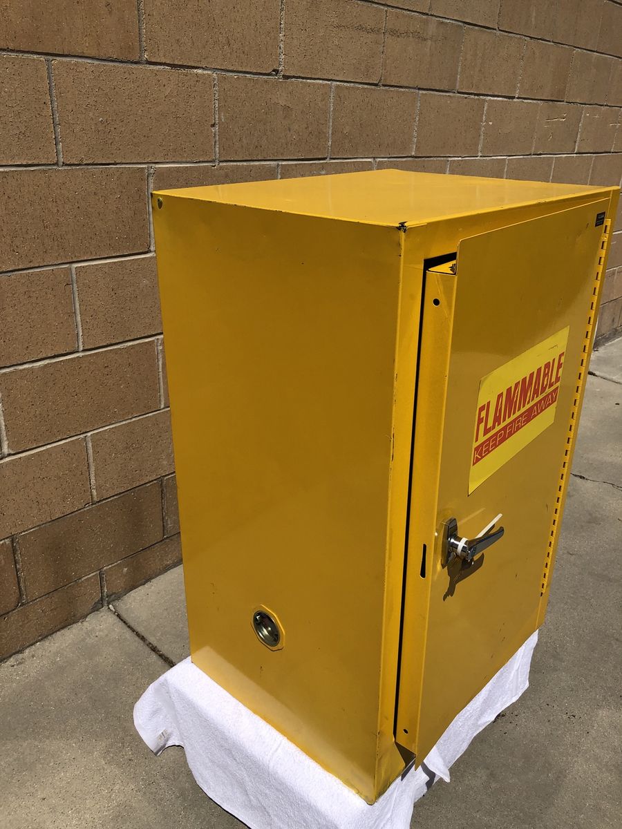 Edsal/Safety Storage Cabinet for Flammable Liquids. Model # SC12F/ 12 Gallon/ 23x18x35/ Locking Cabinet with 2 keys. Galvanized shelve rests on fixed shelf supports adjustable on 2 1/2” centers. Vent covers are installed on both inside and outside of the cabinet. Cabinet leg levelers enable you to level the cabinet at 4 points. New!! $200.00!!