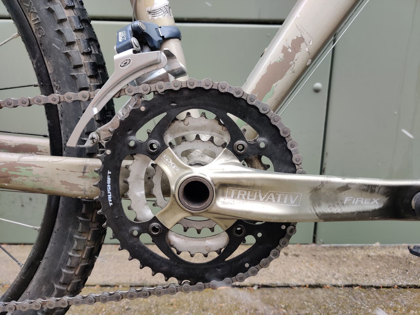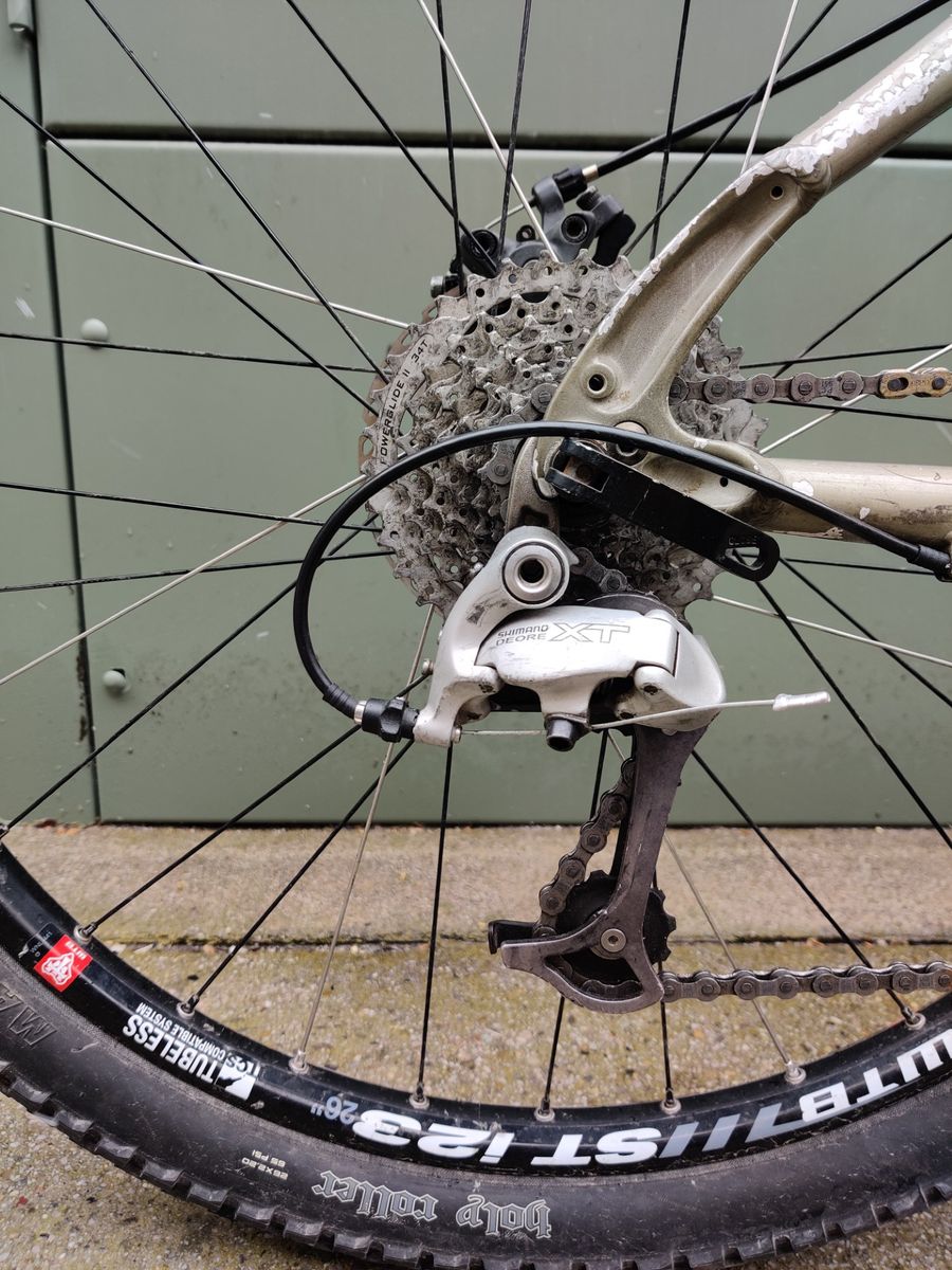 Frame is aluminum alloy. Components include shimano deore xt brakes and shifting, as well as truvativ cranks and hollow bottom bracket. The rims are tubeless compatible.