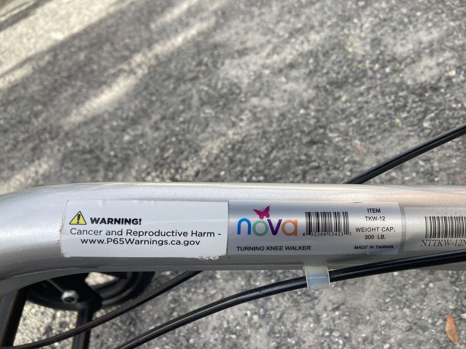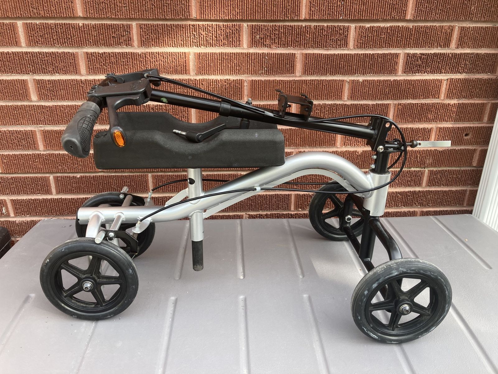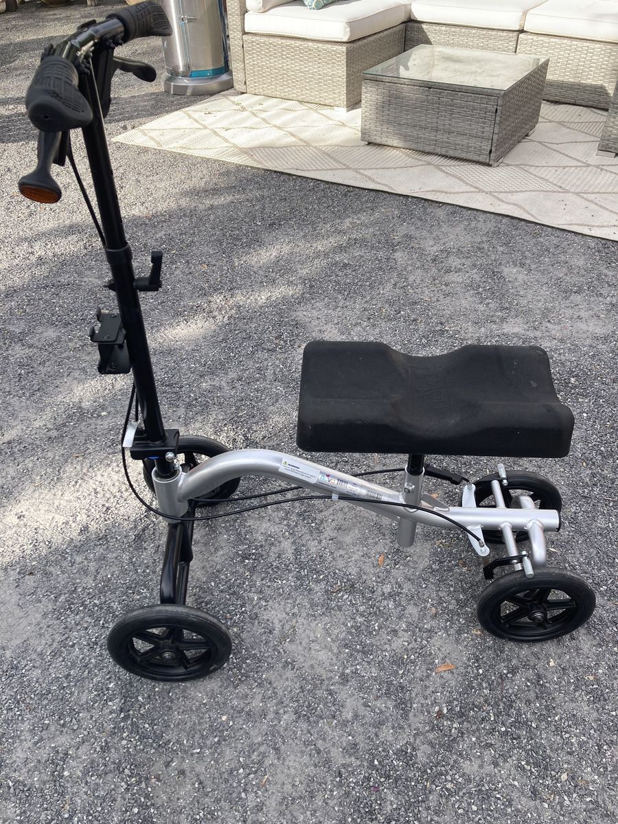Nova Knee Walker holds up to 300 pounds with brakes and 4 wheels. Folds down for storage. Comes with washable cover. See photos please. post