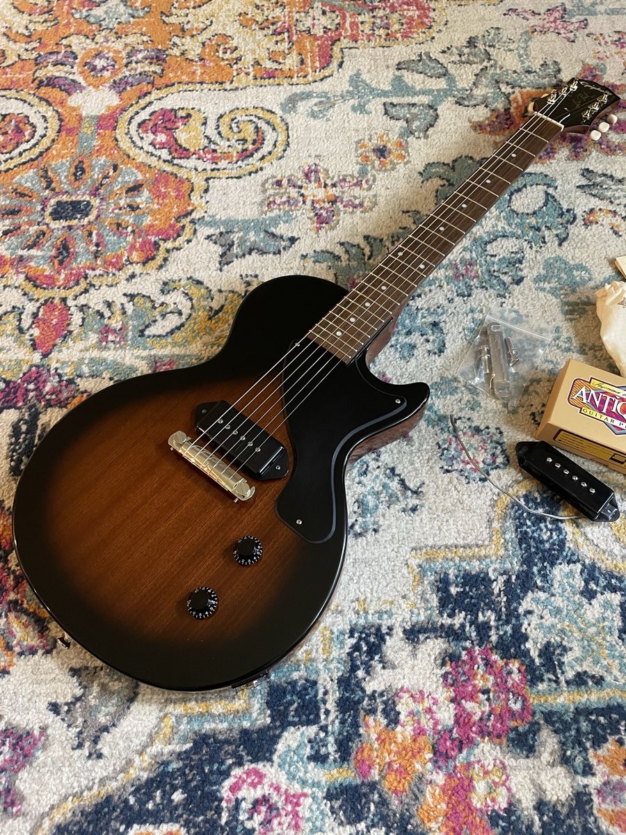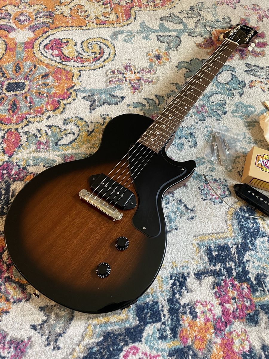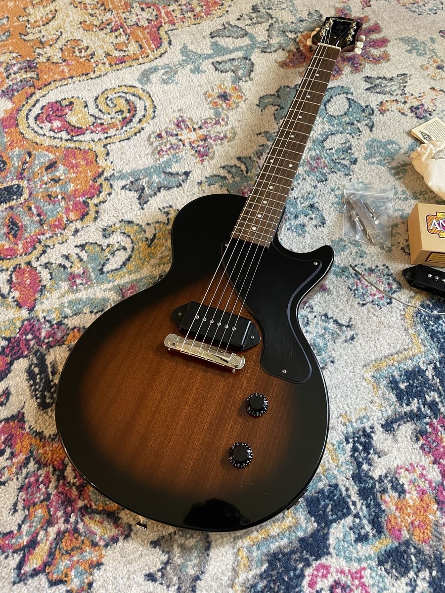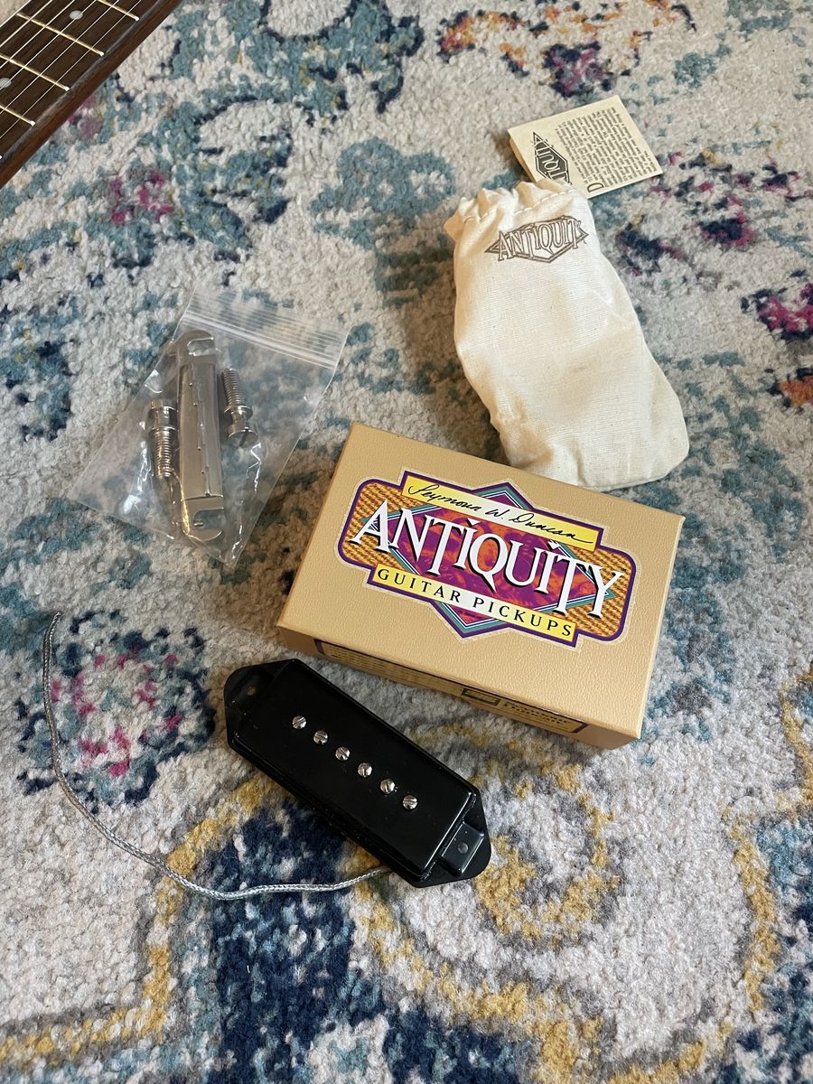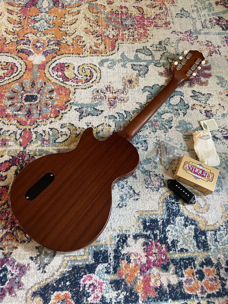 Just professionally cleaned, adjusted and set up by me Upgraded Seymour Duncan antiquity P90 dog ear. (Original Pro P90 included) Upgraded CTS pots and orange drop cap Cream city bridge (original included) Very good tone from this. Smooth playability