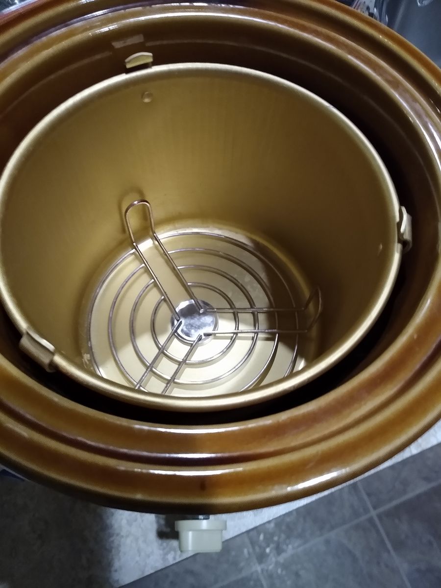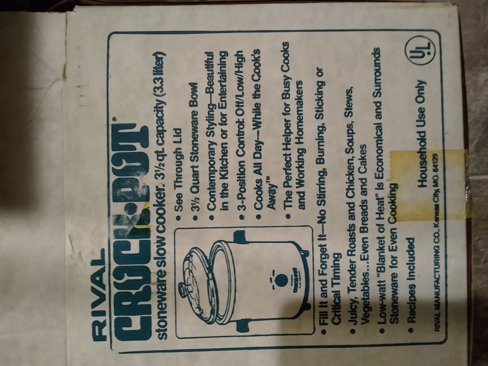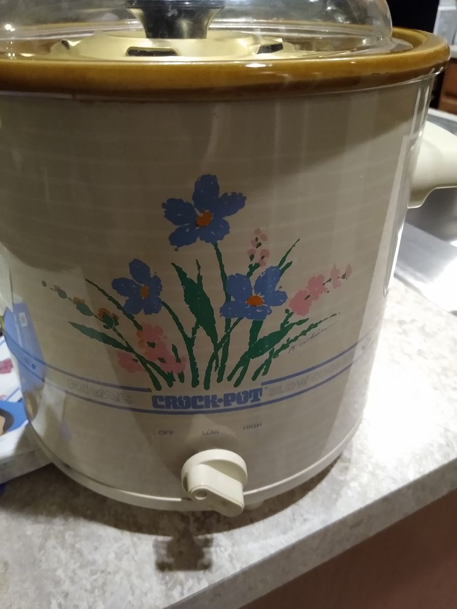Rival Crockpot Stoneware Slow Cooker ‘Floral’ Model 3100P. It has a 3 ½ quart capacity and includes the meat rack, bread/cake pan, instruction booklet and original box. Bonus: A hardcover cookbook is included. Cash only please.