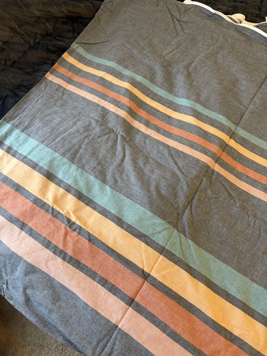 VenmoQueen reversible duvet cover (100% cotton). Teal, denim blue, orange, and mustard stripe design — two different patterns on each side.