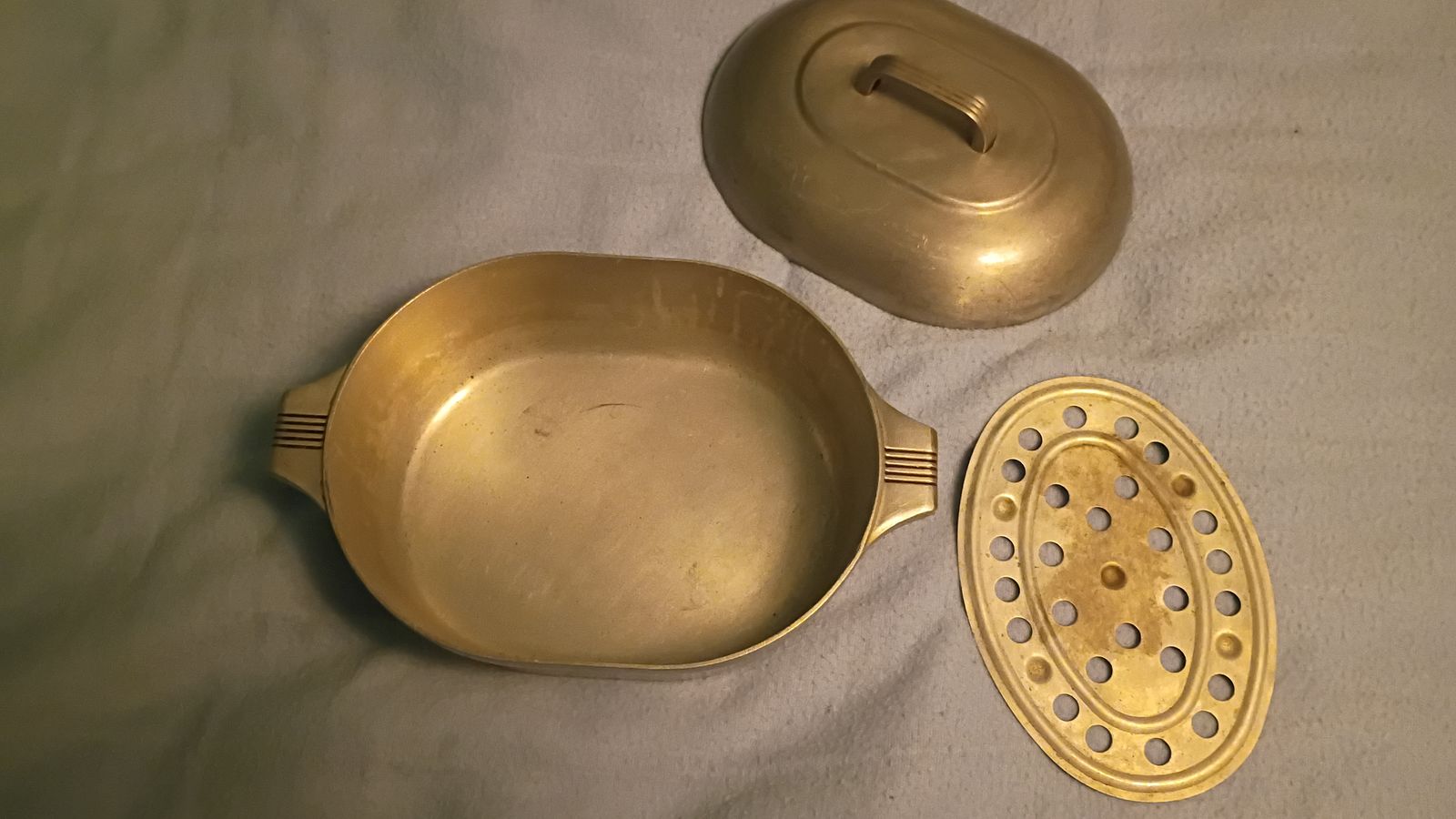 "The Wagner Ware Magnalite 4265-P is a highly sought-after vintage 8-quart oval roaster/Dutch oven, often with a self-basting lid and trivet, manufactured in Sidney, Ohio."